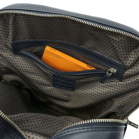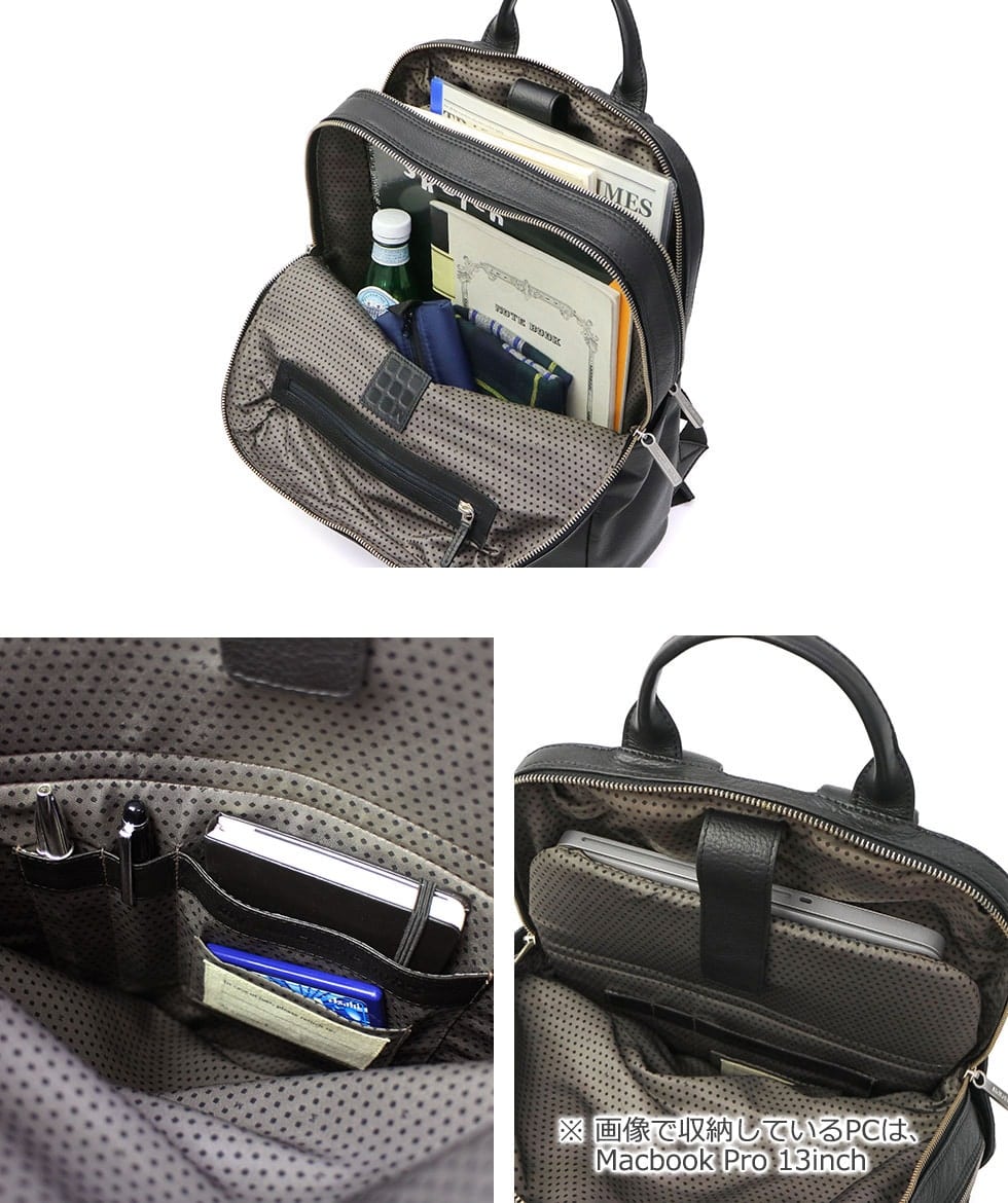 A4サイズのゆったり収まるメイン収納部は、2層式で、ペットボトルやお財布などの荷物と大切な書類を仕分けられます。「アイデアを外出先でも逃さない」というコンセプトの設計が特徴で、背面収納にペンホルダーとモレスキンノート用という設定のポケットを配置。15インチまで対応したPC収納部も装備しました。