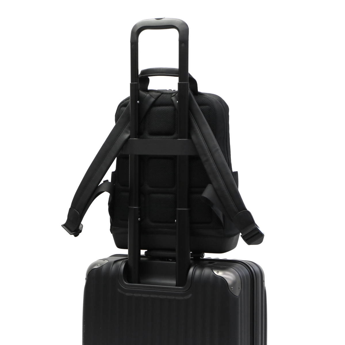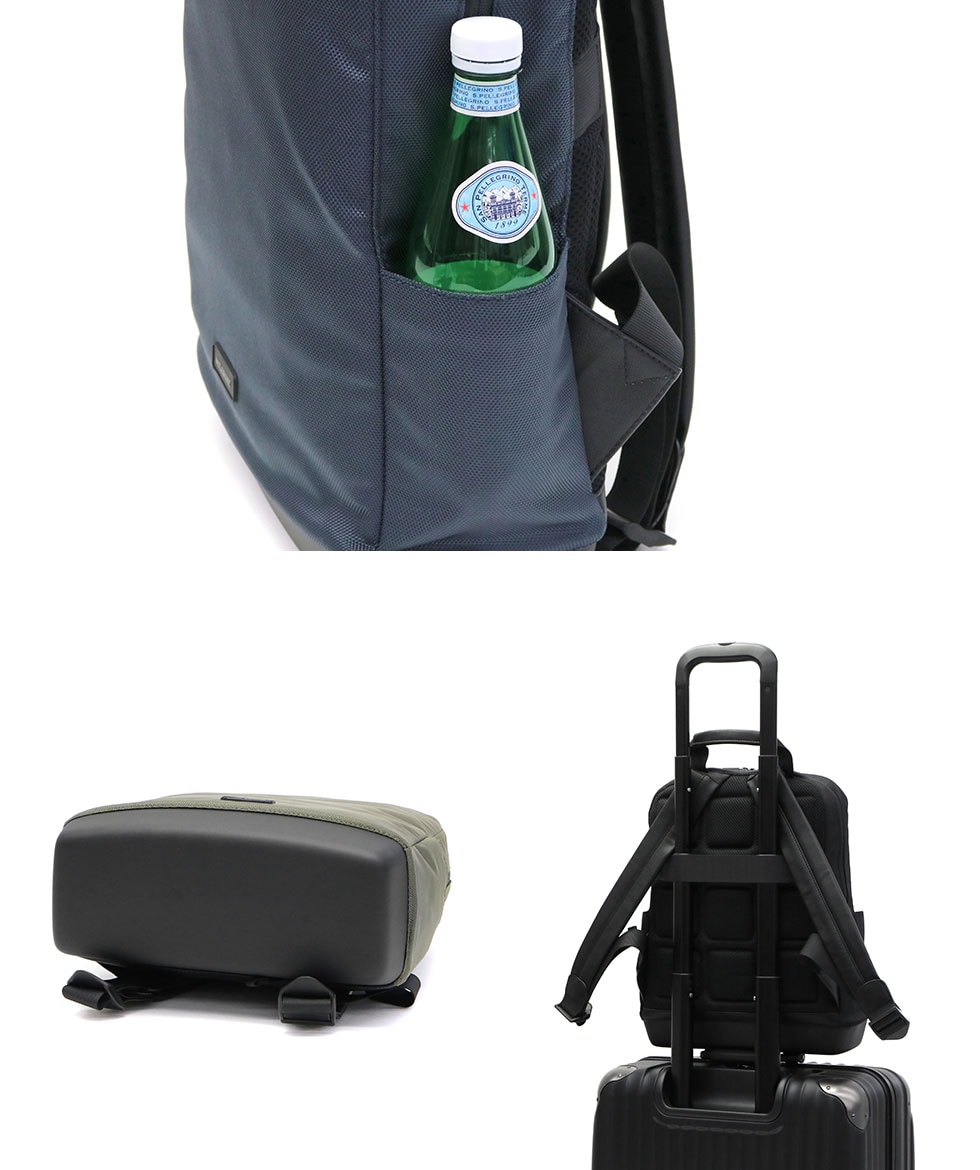 本体アウトスペースには、側面にスマートフォンやパスケースの収納に最適な小分けポケットを装備。また、自立可能なハードシェル素材の底面と、背面にはスーツケースに連結できる機能を搭載していますので、出張や旅行先でも快適なアイテムの取り出しと移動を促してくれます。