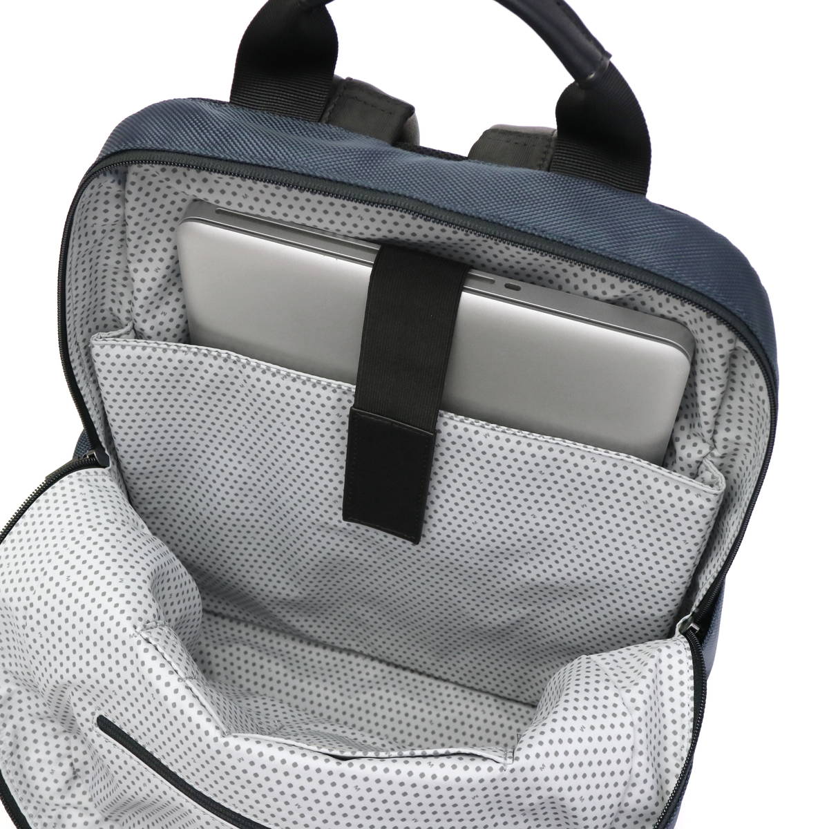 メイン収納部は、A4サイズのファイルやステーショナリーをゆったり収められるサイズ感。「アイデアを外出先でも逃さない」というコンセプトの設計が特徴で、背面収納にペンホルダーとモレスキンノート用という設定のポケットを配置。15インチまで収められるPC収納部も設けました。