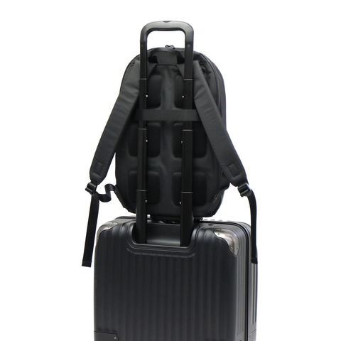 背面にはクッションを内蔵した、15インチノートPC対応ポケットを配置。独立したスペースで瞬時に取り出しが可能です。さらに、スーツケースにセットアップできる機能を備えており、快適な移動をサポートしてくれます。