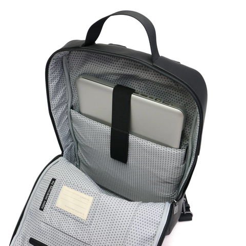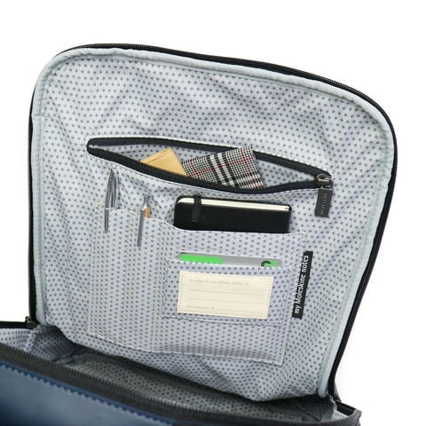 メイン収納部はB4サイズに対応し、書類や貴重品の収納も楽々。「アイデアを外出先でも逃さない」というコンセプトの内装デザインで、ペンホルダーとモレスキンノート用という設定のポケットを配置しました。PC収納部は15インチまで対応しているので、ビジネスシーンにも役立ちます。