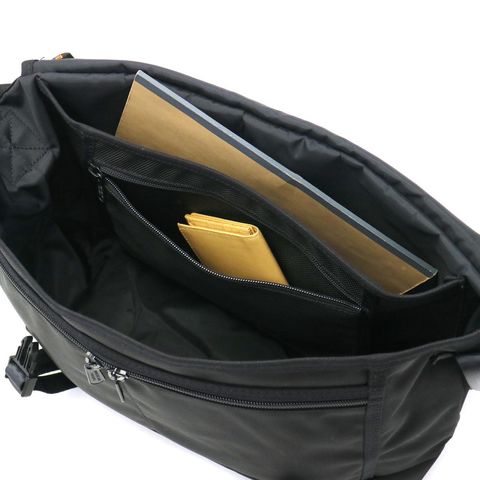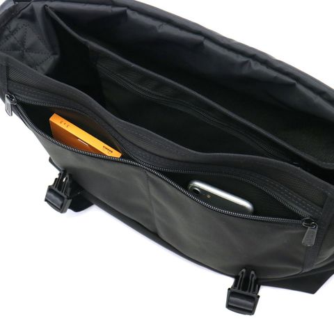メインルームはA4サイズに対応し、スマートフォン・ペットボトル・長財布といった日常アイテムを収納するのに十分なサイズ感。収納口はフラップ付きのバックルスタイルで、イージーな開閉が可能です。さらにフラップ下にもポケットを備えた、利便性の高いつくりとなっています。