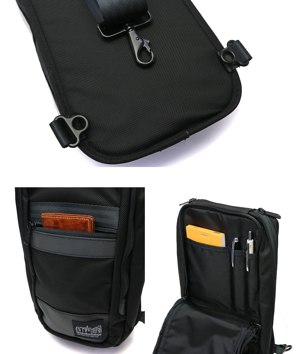 本体外側には正面に2ヶ所のジップポケットが装備されています。内部にはペンホルダーなどが内蔵されており、アイテム別に種別管理ができるので使いやすく内部を保つことが可能です。また、ストラップの接続部は左右に設けられており、心地よい使用感の方をお選びいただけます。