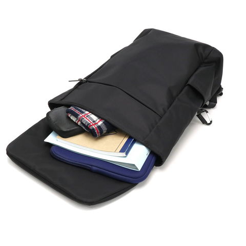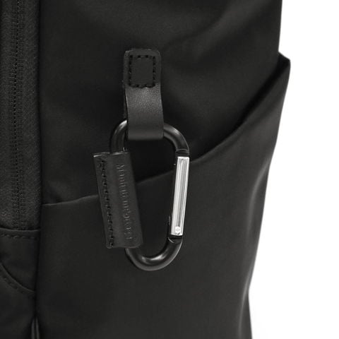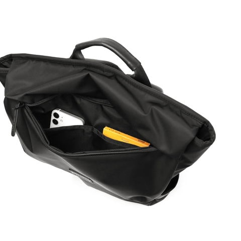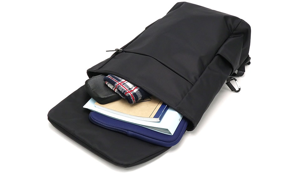 マグネット開閉のメインルームは、B4サイズが収まり、適度なマチ幅も備え収納力があります。ファイルや書類を楽々収められるため、タウンユースから通勤通学にもおすすめです。また、ポケットやカラビナなど小物の整理に役立つ機能が充実し、細かいアイテムも埋もれてしまうことなく快適に管理できます。