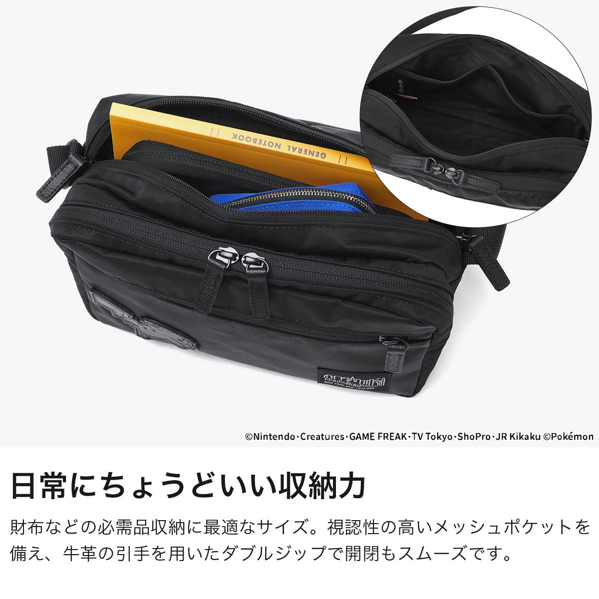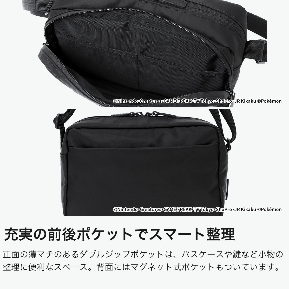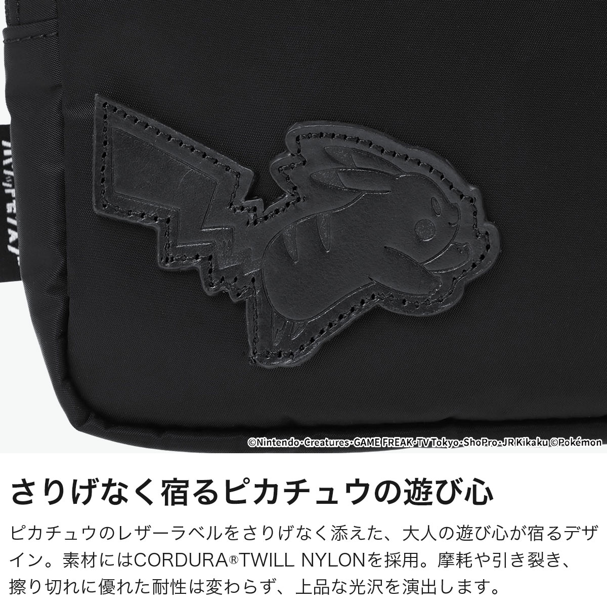 世界中で愛される「ポケットモンスター(ポケモン)」デザインのコレクションから登場したショルダーバッグ。メイン素材にCORDURA TWILL NYLONを採用し、洗練されたスタイルにピカチュウのレザーラベルでミニマルな中にさりげないアクセントを際立たせます。牛革プーラーが上質な印象を高め、ディテールにまで配慮されたデザイン。薄マチのダブルジップポケットや内側メッシュポケット、マグネット仕切りで小物を整理しやすく、使い勝手も抜群です。
