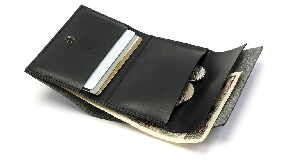できるだけ余分な部品や機能を足さず、革に包んでホックを留めるだけで成立させることを目指したコンパクトな三つ折り財布。「財布」的にならないデザインが本体をより小さく感じさせ、身軽な仕上がりに。ポケットや小さなバッグにもしまいやすいスマートなアイテムです。