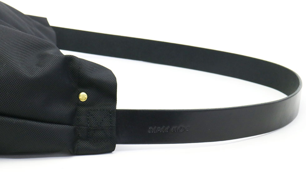 収納口にはギボシボタンを設け、しっかりと中身を覆うこともできます。また、レザーのショルダーストラップにはJAPAN MADEの刻印が施されています。
