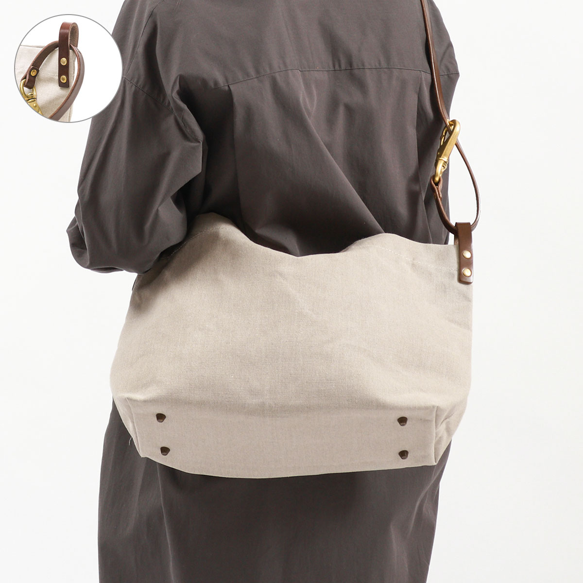 麻帆布とレザーの持ち手のコンビネーションがポイントの麻帆布ショルダーバッグ。使い込むほどにレザーショルダーのツヤと、麻帆布のくったりとした風合いが増し、経年変化も楽しんでいただけるデイリー使いにぴったりなバッグです。