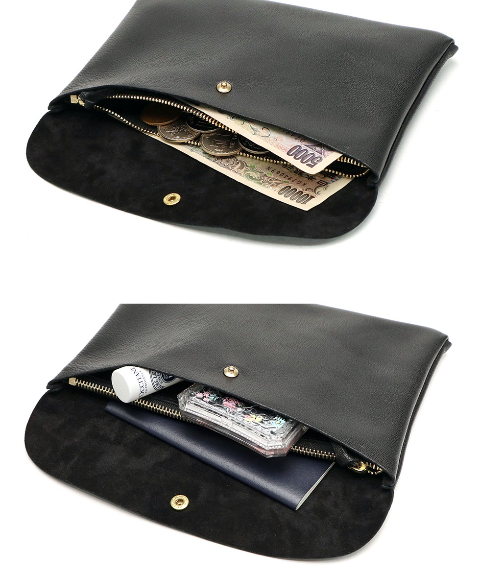 お財布として、小物入れとして。こちらのポーチはそれぞれのライフスタイルに合わせ自由にお使いいただけます。紙幣は折り畳まず、パスポートや通帳もすっきり収まる使い勝手の良い大きさです。スリムなシルエットなのでカバンの中に入れてもかさばりません。