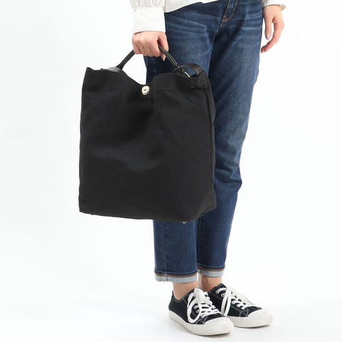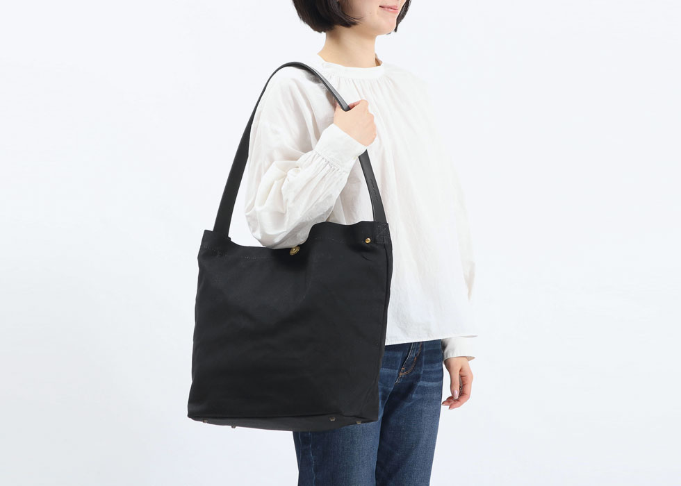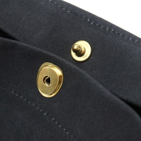 収納口にはパチッと簡単に開閉できるギボシボタンを採用。底マチがしっかりとしたデザインで、A4サイズのアイテムも難なく収納可能です。また、底鋲を備えているので汚れにくいのもポイントのひとつです。