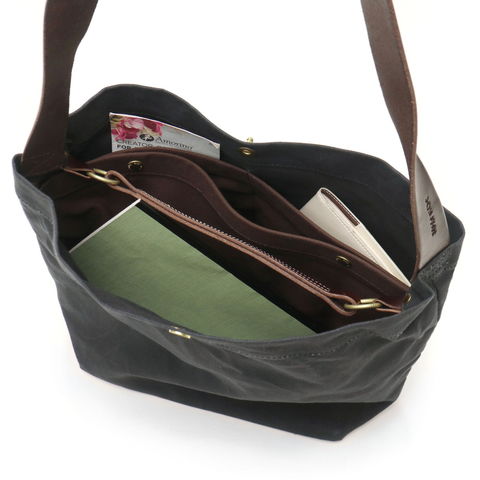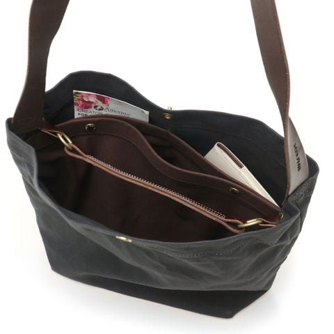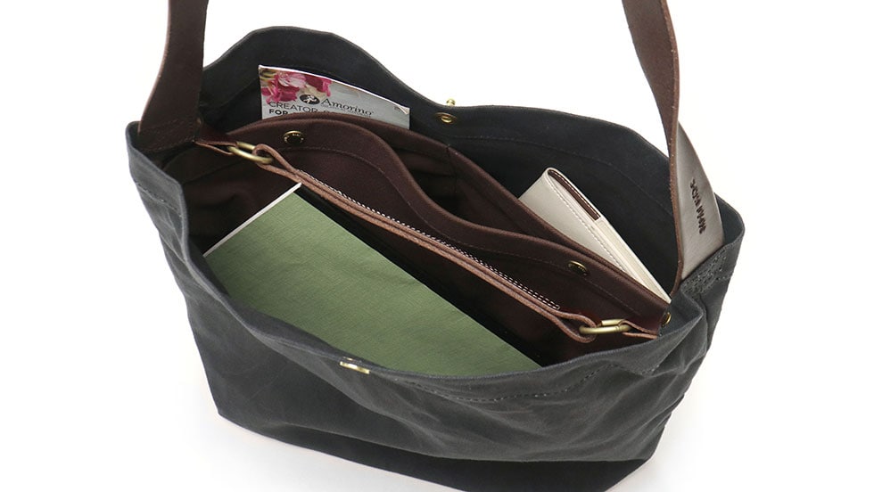 内装には広々とした計3ヶ所のポケットを備えております。手帳やスマートフォンなどの小物類を見やすく仕分けることができ、荷物の取り出しもスムーズになりそうです。