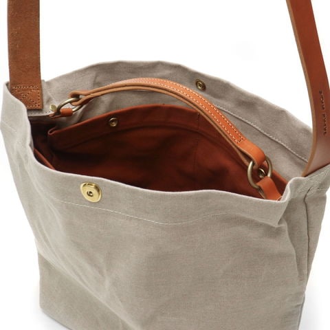 リネンキャンバス×栃木レザーで魅了する2WAYショルダーバッグ。カジュアルな麻帆布に、JAPAN MADEの刻印が施されたレザーストラップを組み合わせ、上品かつスタイリッシュな雰囲気に。さらに、内側の小さいハンドルでトートバッグとしても使え、デザイン性と機能性を兼ね備えたアイテムとなっています。