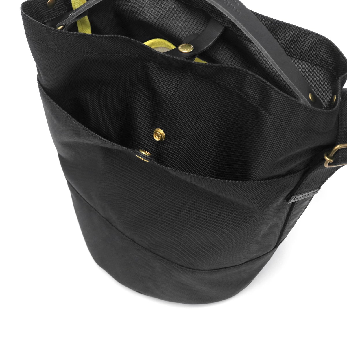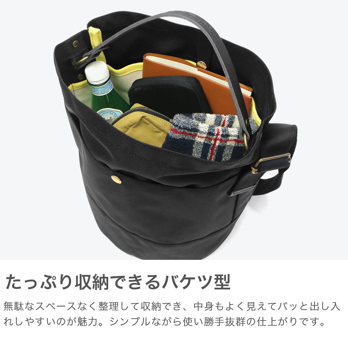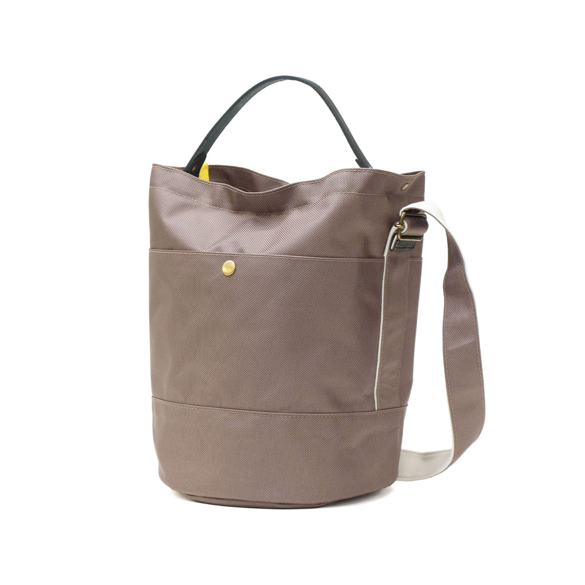 丈夫な66ナイロンと姫路レザーを組み合わせた、バケツ型のデザインが特徴の2WAYショルダーバッグ。ヨーロッパのガーデニング用バッグをモチーフにし、しっかりとした丸い底板があることで立てても置けて、ランチボックスなど厚みのあるものもきちんと持ち運べます。内側には鮮やかなイエローカラーのパイピングが施され、絶妙なアクセントに。レザーのハンドルを持ってトートとしても、お持ちいただけます。