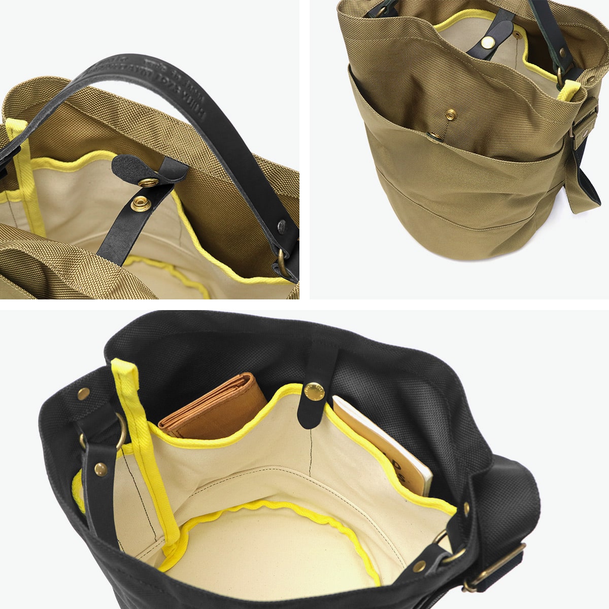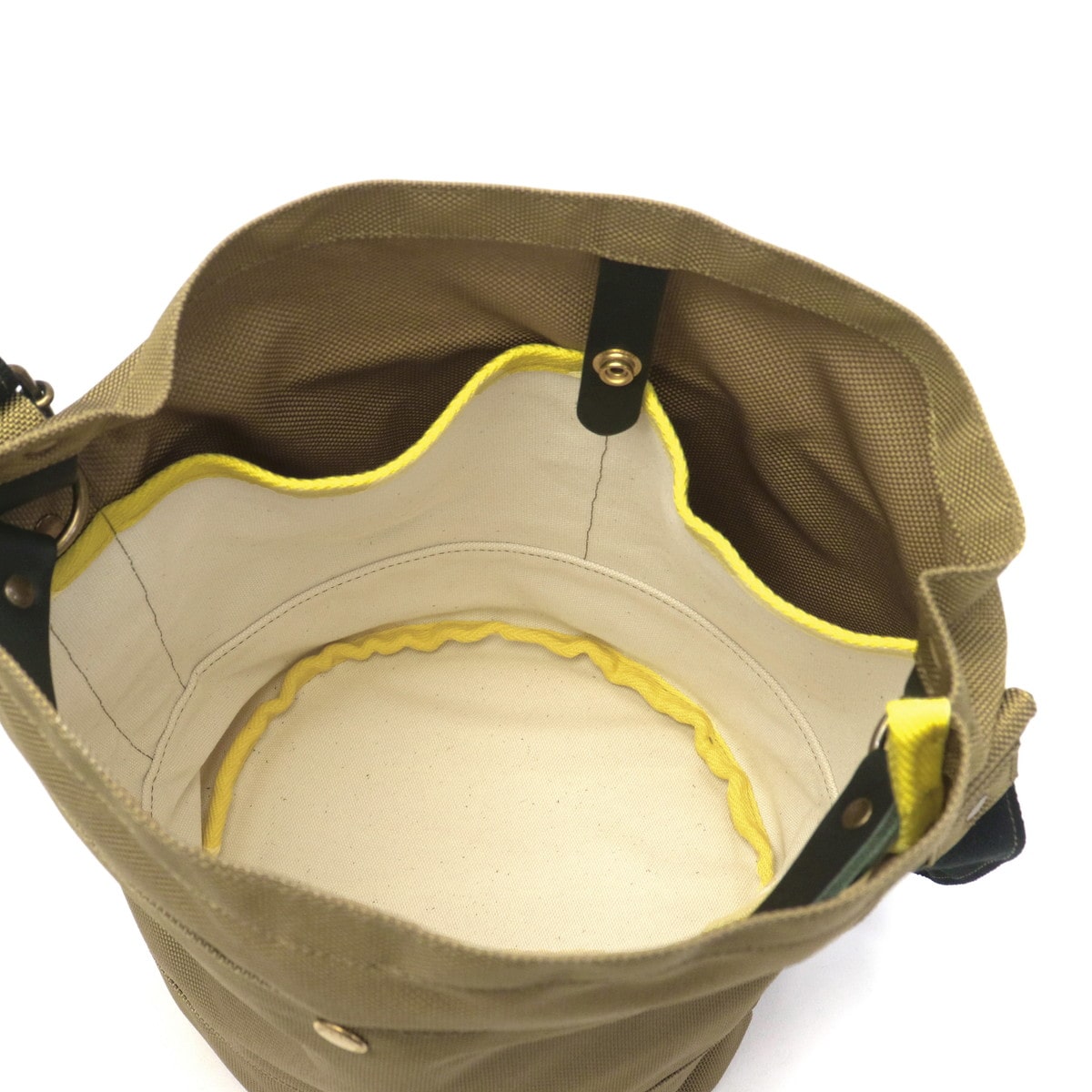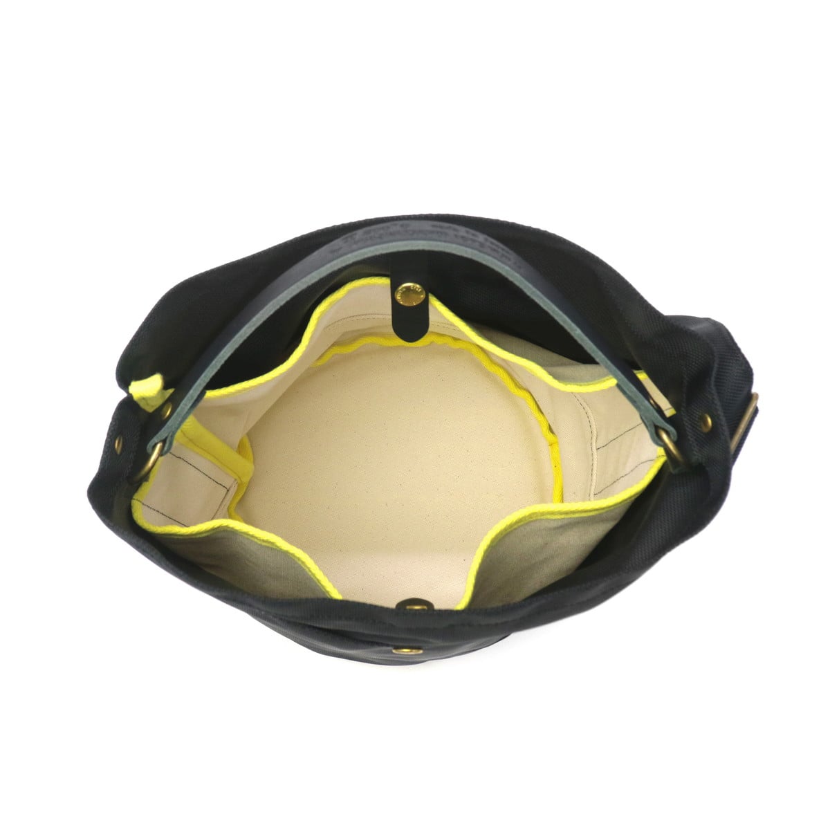 丈夫な66ナイロンと姫路レザーを組み合わせた、バケツ型のデザインが特徴の2WAYショルダーバッグ。ヨーロッパのガーデニング用バッグをモチーフにし、しっかりとした丸い底板があることで立てても置けて、ランチボックスなど厚みのあるものもきちんと持ち運べます。内側には鮮やかなイエローカラーのパイピングが施され、絶妙なアクセントに。レザーのハンドルを持ってトートとしても、お持ちいただけます。