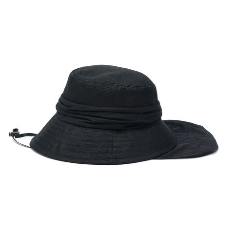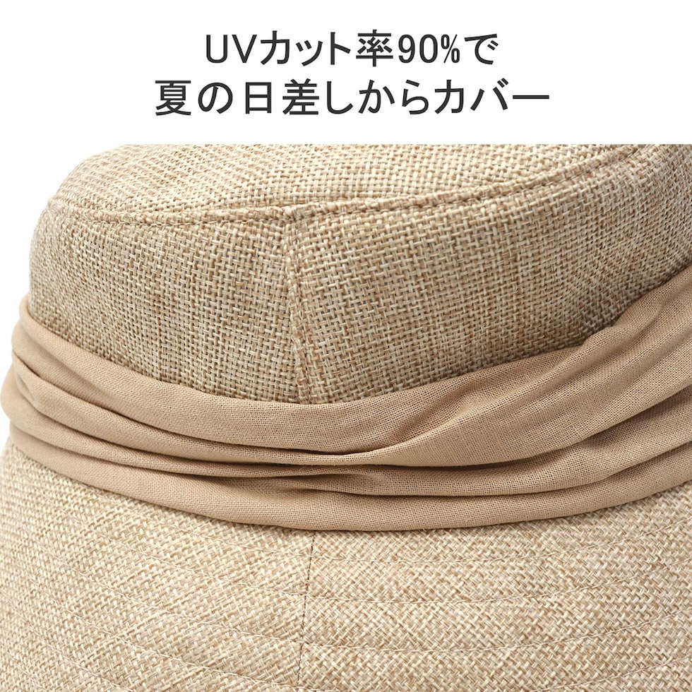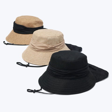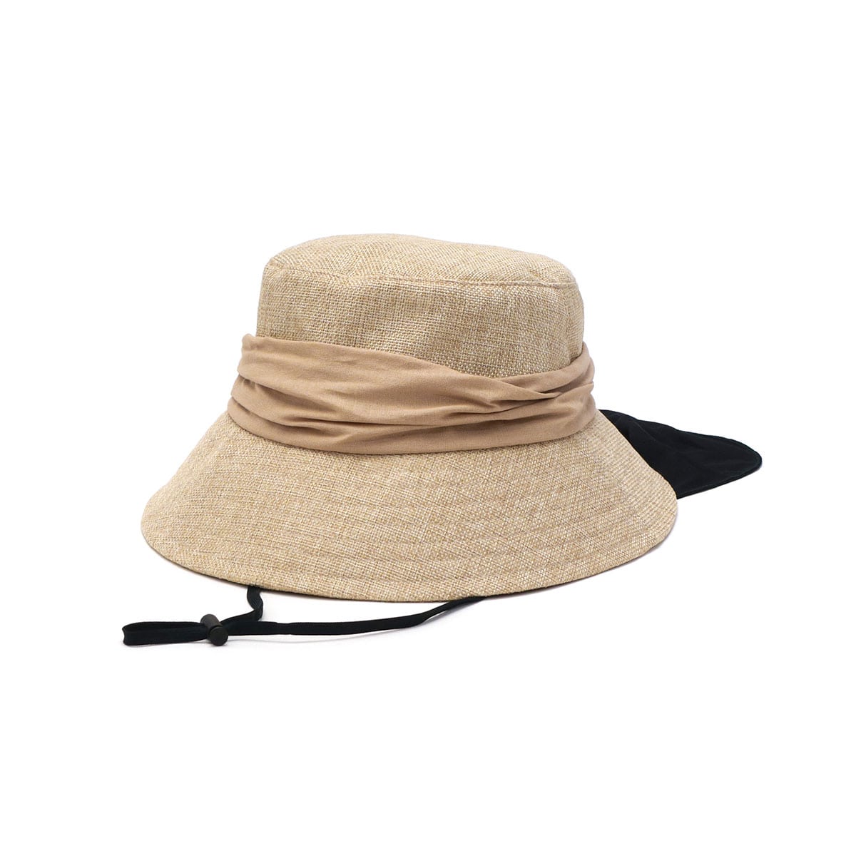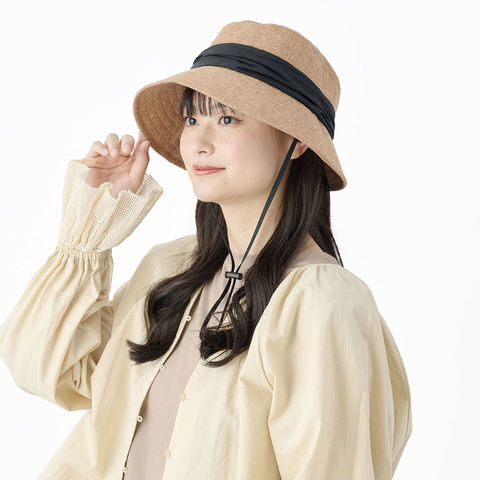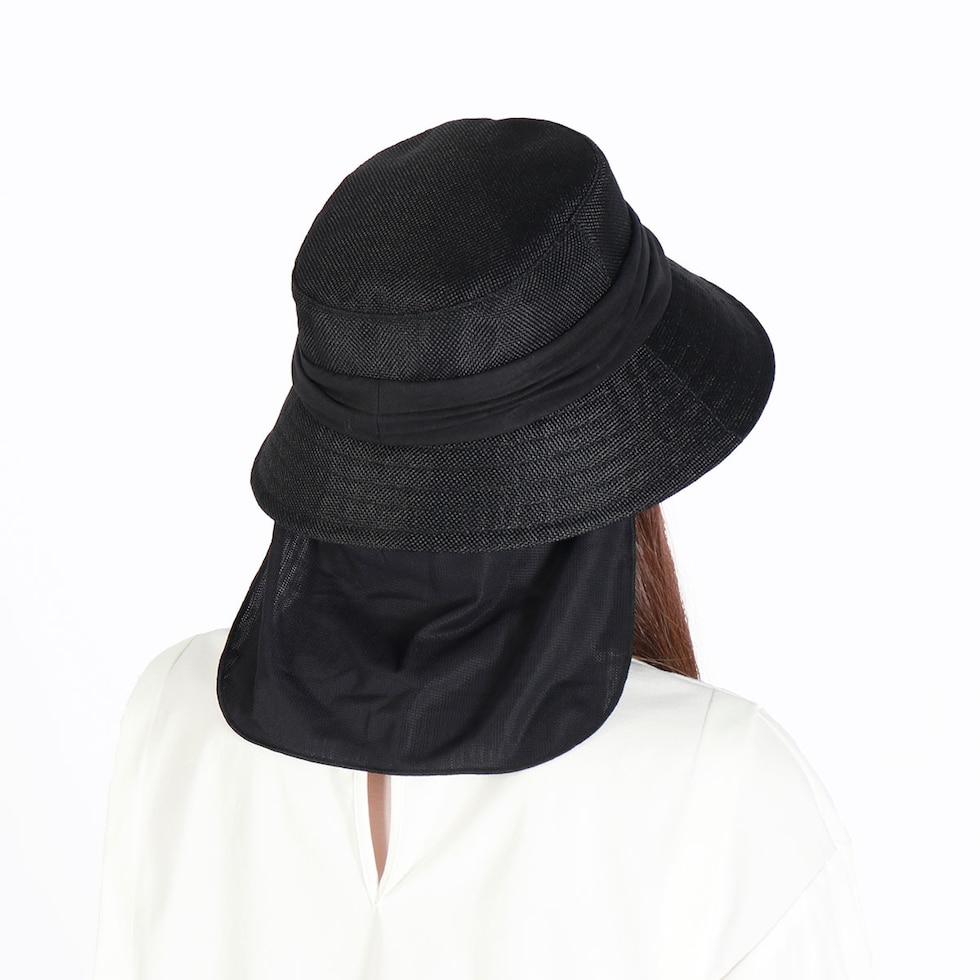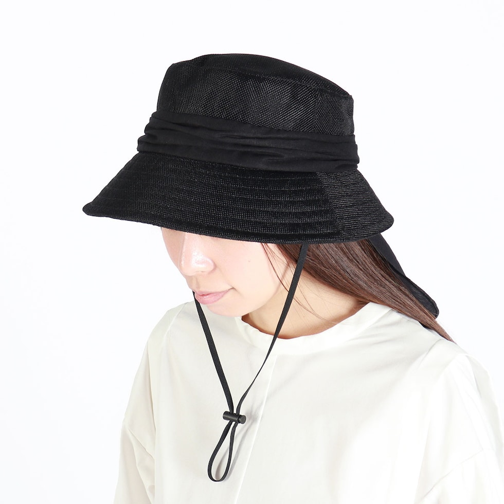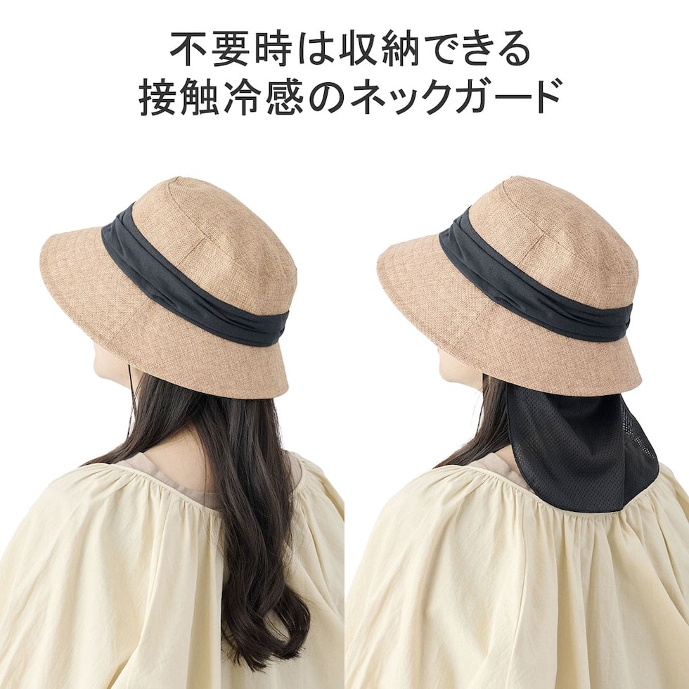 近年カジュアルアイテムの定番になりつつあるバケットハットを、エレガントなテイストにデザイン。女性らしいドレープと下がりめのツバがポイントです。UVカット機能も完備しており、厳しい暑さ・紫外線対策もばっちり!さらに接触冷感のネックガード付きで、首元をひんやりと冷やしてくれます。