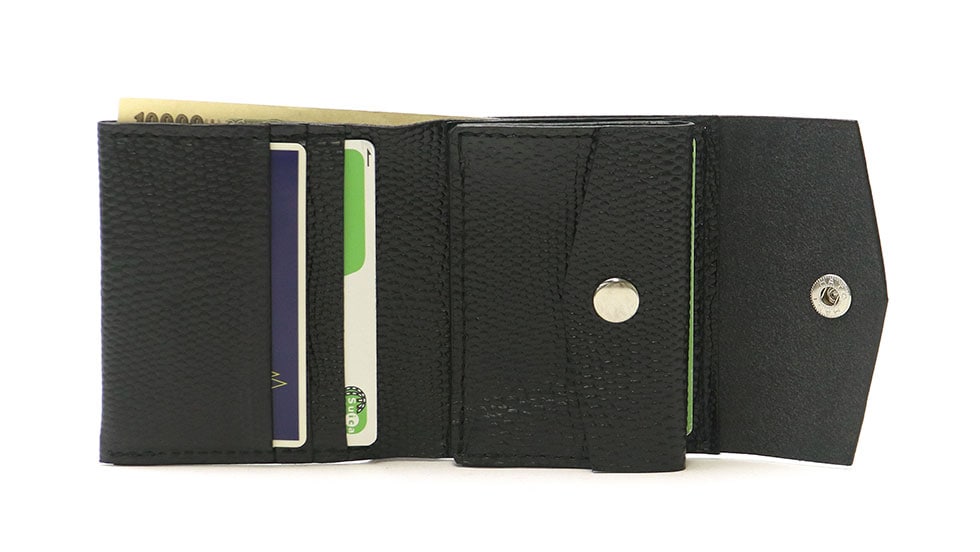 内装は札入れ、小銭入れ、カードポケットをしっかりと備えたシンプルで使い勝手の良いデザイン。カードポケットは開いてすぐのところに3ヶ所と、小銭入れの後ろに2ヶ所備えており、小さくても必要な収納力が備わったつくりが魅力です。