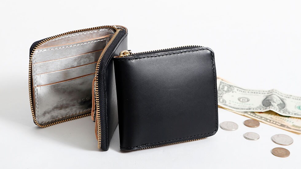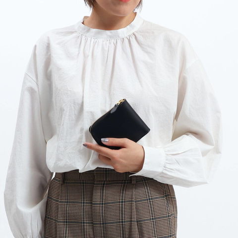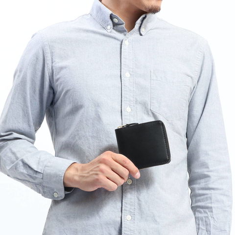 本体はジップを開くと大きく開く二つ折り仕様。中身が見渡しやすく、普段持ち歩くカードや紙幣が最低限でまとまり、駐車券などを整理できるポケットも備わっているのでデイリー使いに最適。小銭入れはボックス型でお会計時にもスムーズに取り出せるつくりです。