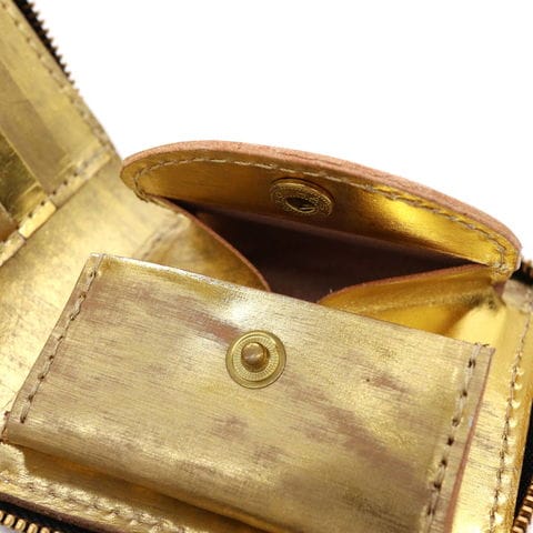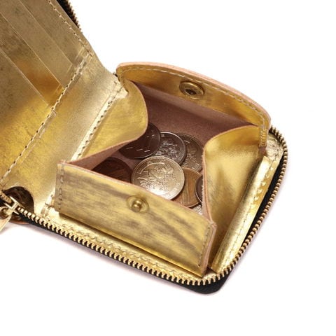 外装はシンプルなブラックの滑らかなレザーを採用。内装には革の表面にそれぞれゴールド、シルバーの顔料を色付けし、サンドぺーパーでやすりをかけアンティーク感のある仕上がりに。使用することで少しづつ箔が落ち、本来の革の色が見えてきます。革の変化を2度3度楽しめる特別なレザーです。