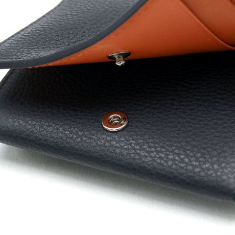 本体素材には柔らかな質感が心地良く手に馴染む牛革スムースを採用し、内装革は存在感のあるオレンジの配色で統一しています。表面のシュリンク型押しは大人の印象を引き立たせるだけでなく、傷が目立ちにくいメリットも。外側のヘリは総コバ塗りとなっており、スッキリとした外観に仕上がりました。