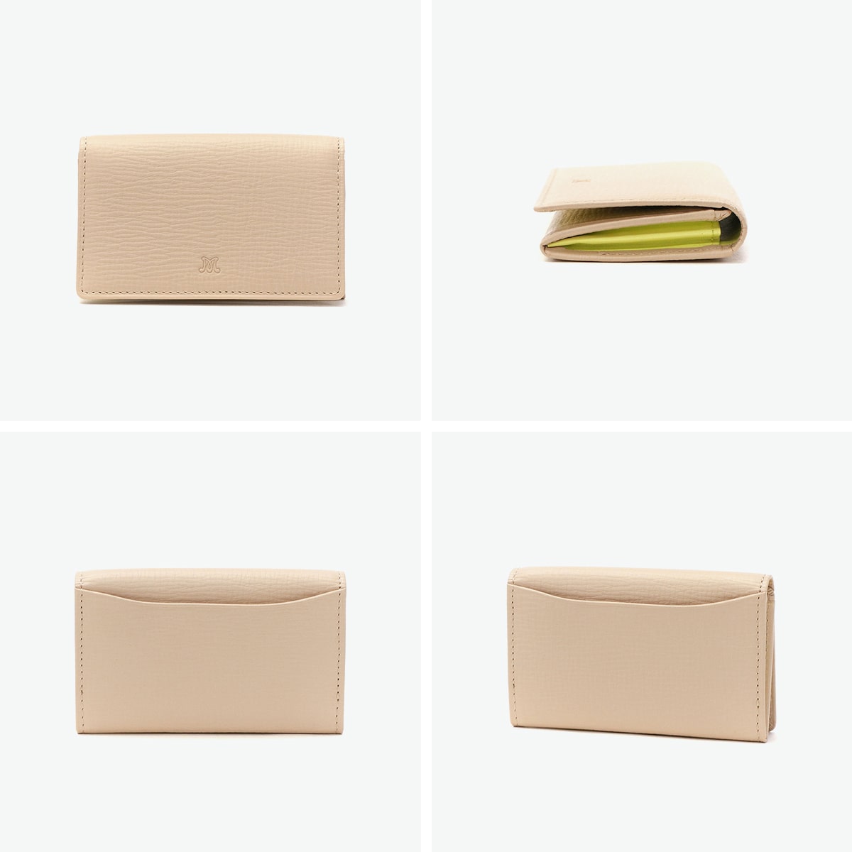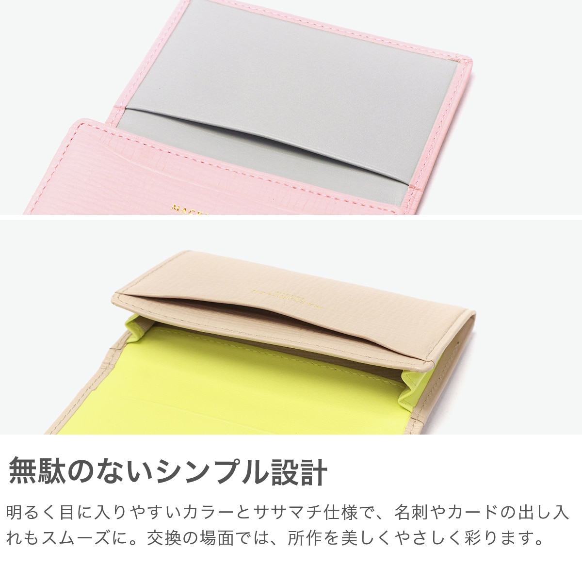 マッキントッシュロンドンのイニシャルロゴを使用した『EM』シリーズの名刺入れ。収納部はササマチタイプになっており、視認性に優れ取り出しやすい作りです。手元を明るく見せてくれるパステルカラーを採用し、優しく爽やかな雰囲気を演出します。外装と内装で異なるカラーを組み合わせることで開いた時のイメージが変わり、より印象的なアイテムとなっています。