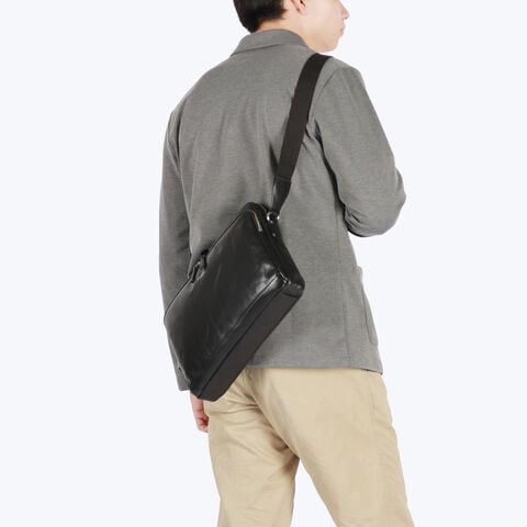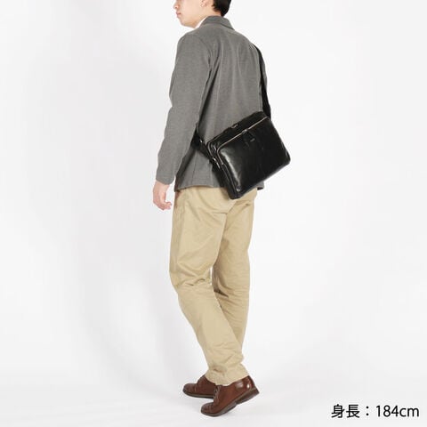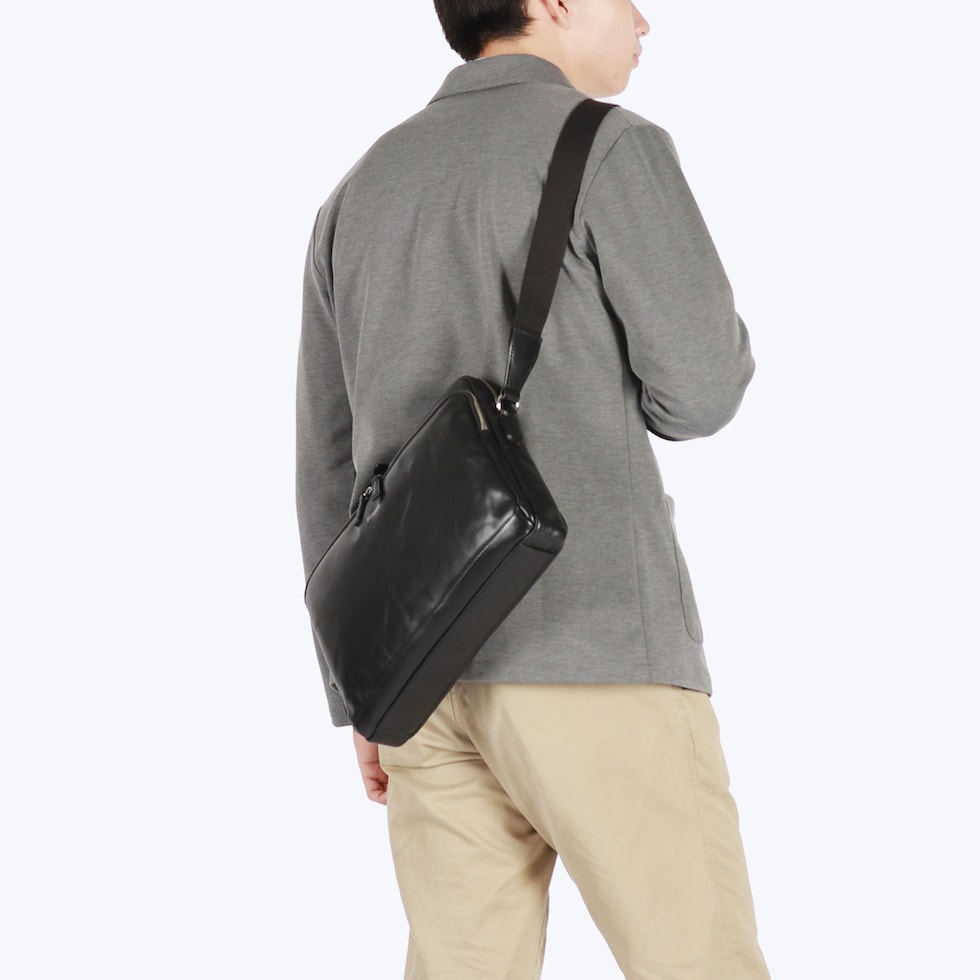 トラッドで洗練されたブリティッシュテイストなシリーズ『ブレイヴァル』のショルダーバッグ。タウンユースから荷物の少ない通勤にも対応できるオンオフ兼用のデザインです。本体素材にはオイルを含ませた上質なレザーを使用し、高級感ある仕上がりに。本体はらA4サイズのアイテムや長財布、500mlペットボトルが収まるサイズ感で、荷物をスマートに持ち運びたい方に最適です。
