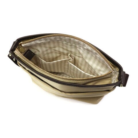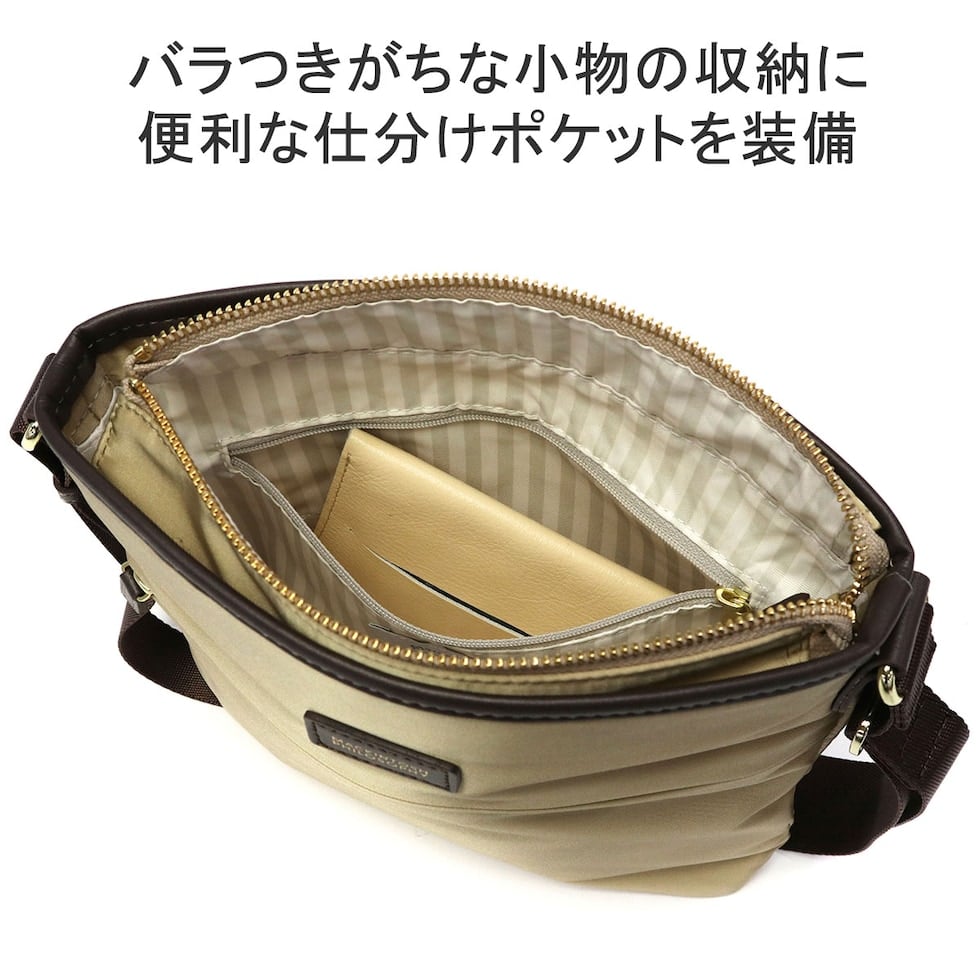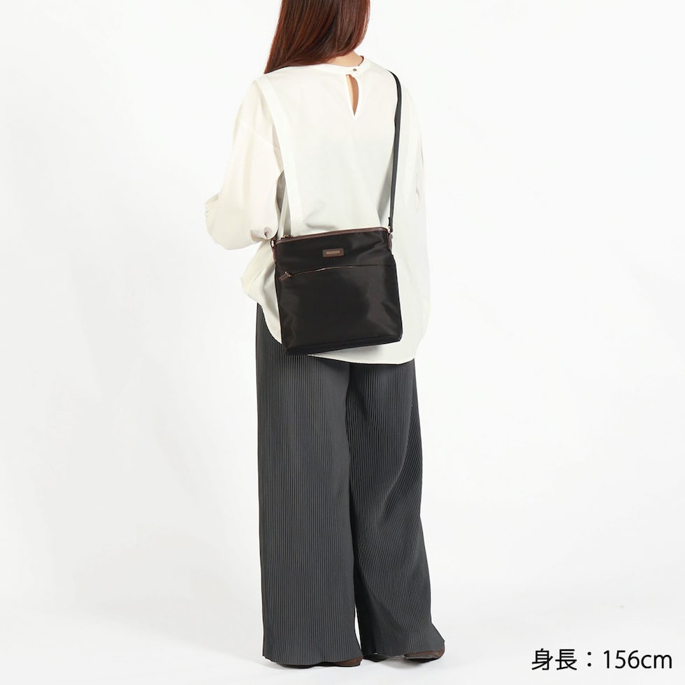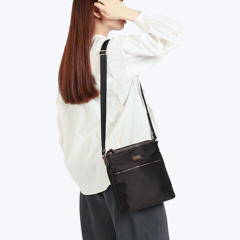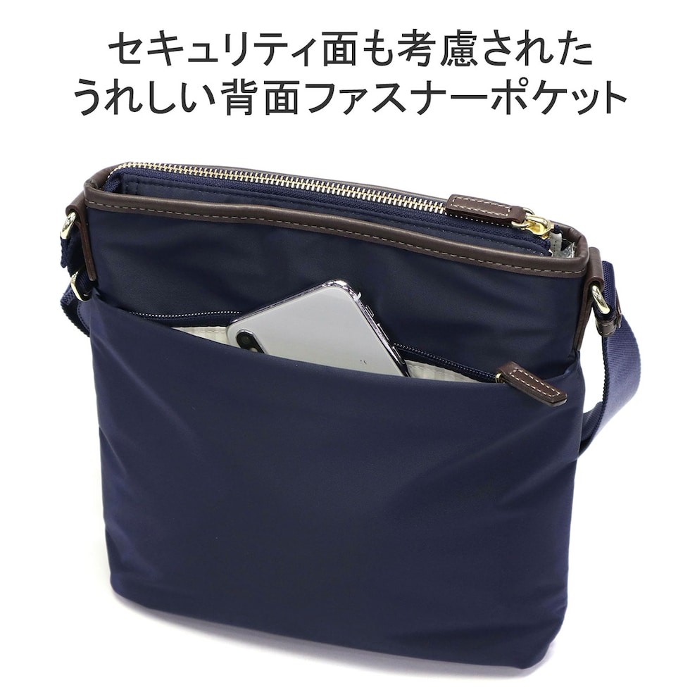 スタイルを選ばない、シンプルで上品なレディーストラベルシリーズ『アメリア2』のショルダーバッグです。薄マチながら収納力に優れ、長財布もすっぽり収まる使いやすいサイズ感。撥水・撥油機能を持つテフロン加工が施された生地で、急な雨にも安心です。光沢のある上品な印象の素材は、普段使いから旅行まで持ちやすいのもポイントです。