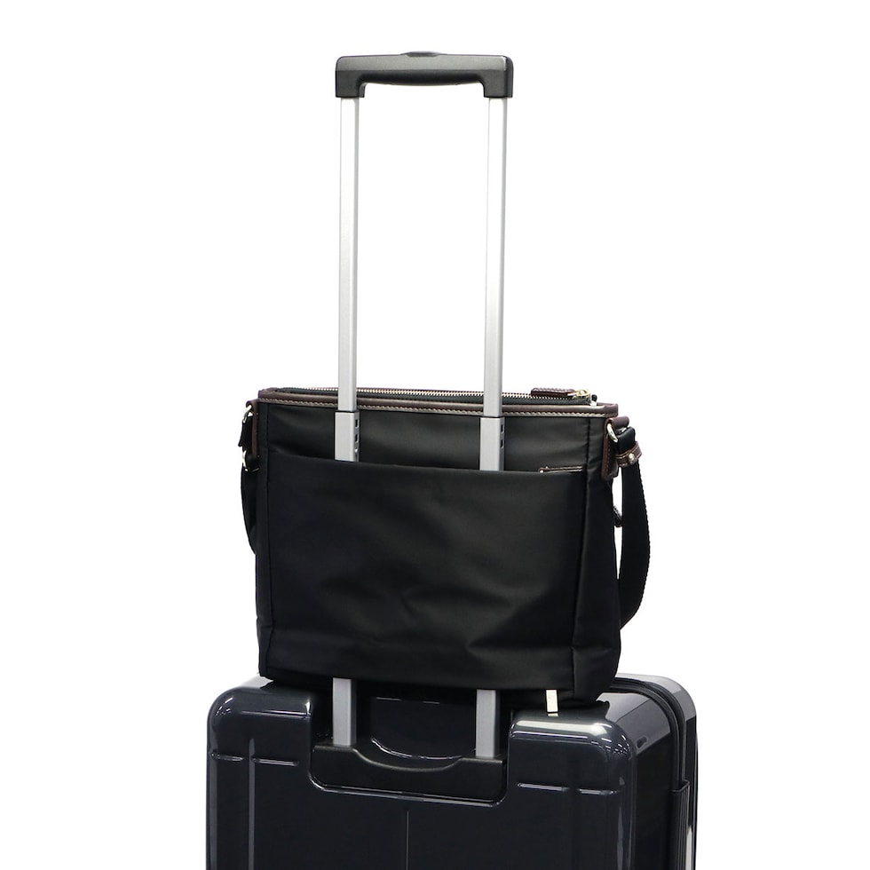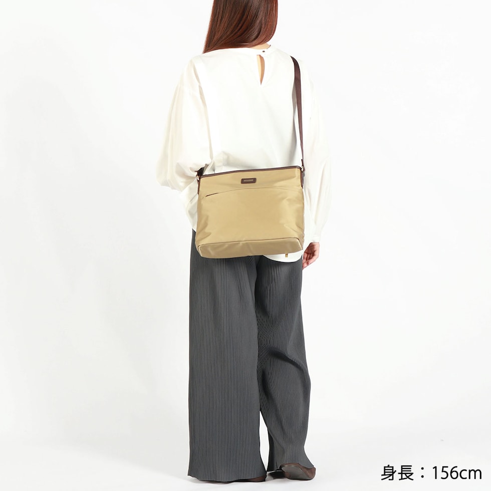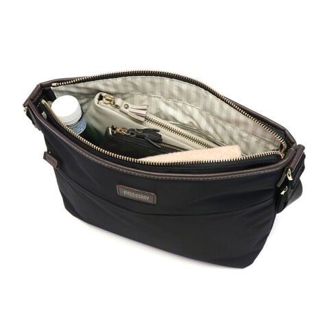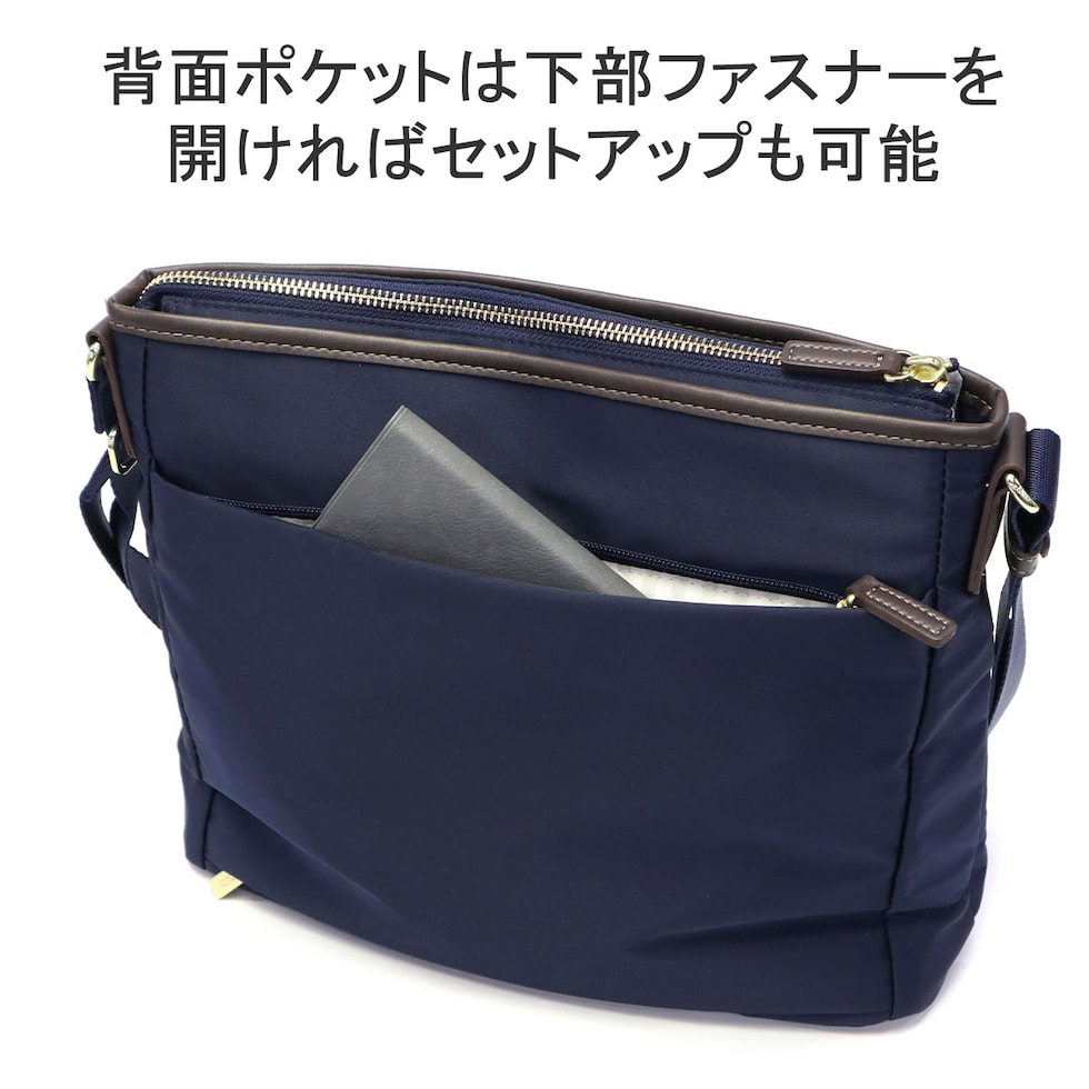 スタイルを選ばない、シンプルで上品なレディーストラベルシリーズ『アメリア2』のショルダーバッグです。薄マチながら収納力に優れ、日常から旅行まで幅広く活躍するアイテムです。B5サイズで、長財布も収納可能な使いやすい大きさが特徴。撥水・撥油機能を持つテフロン加工が施された生地で、急な雨にも安心です。光沢のある上品な素材を使用し、エレガントな印象を演出します。