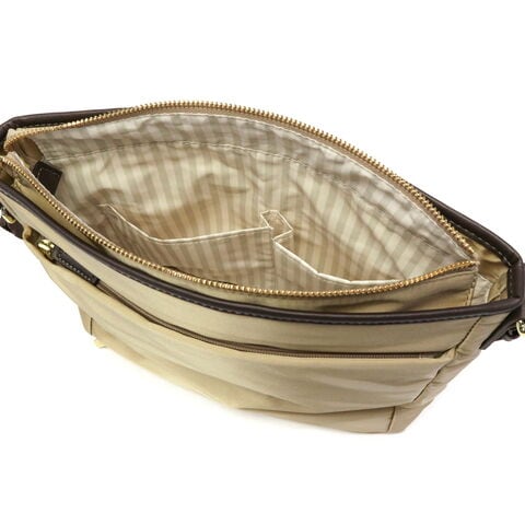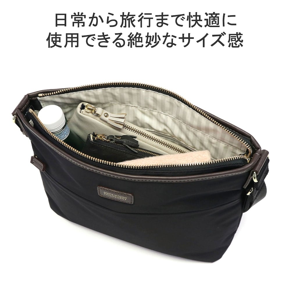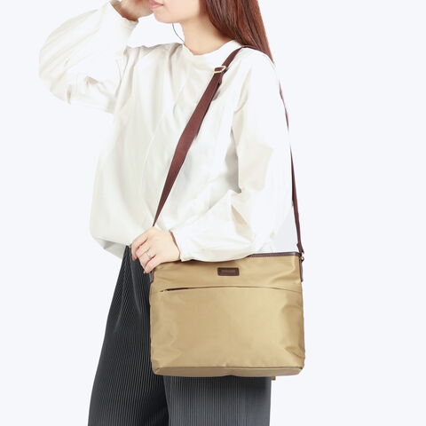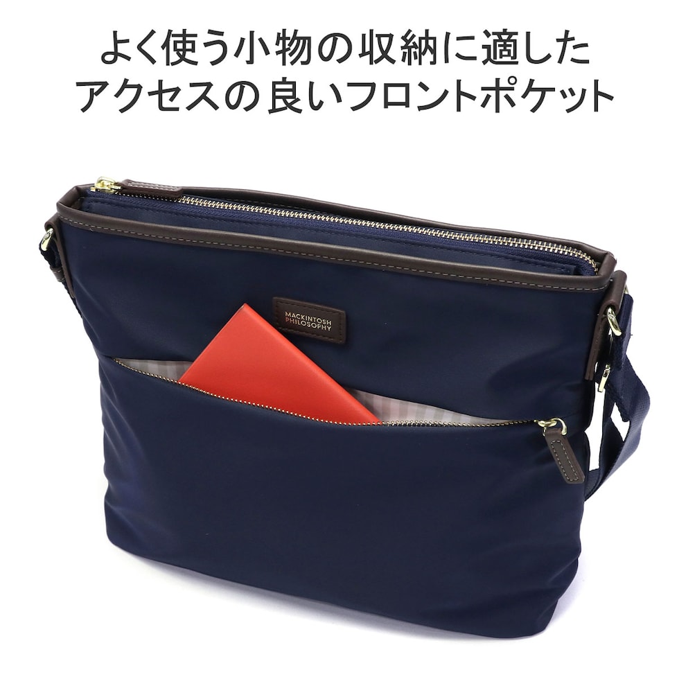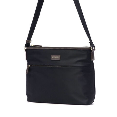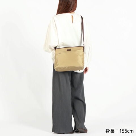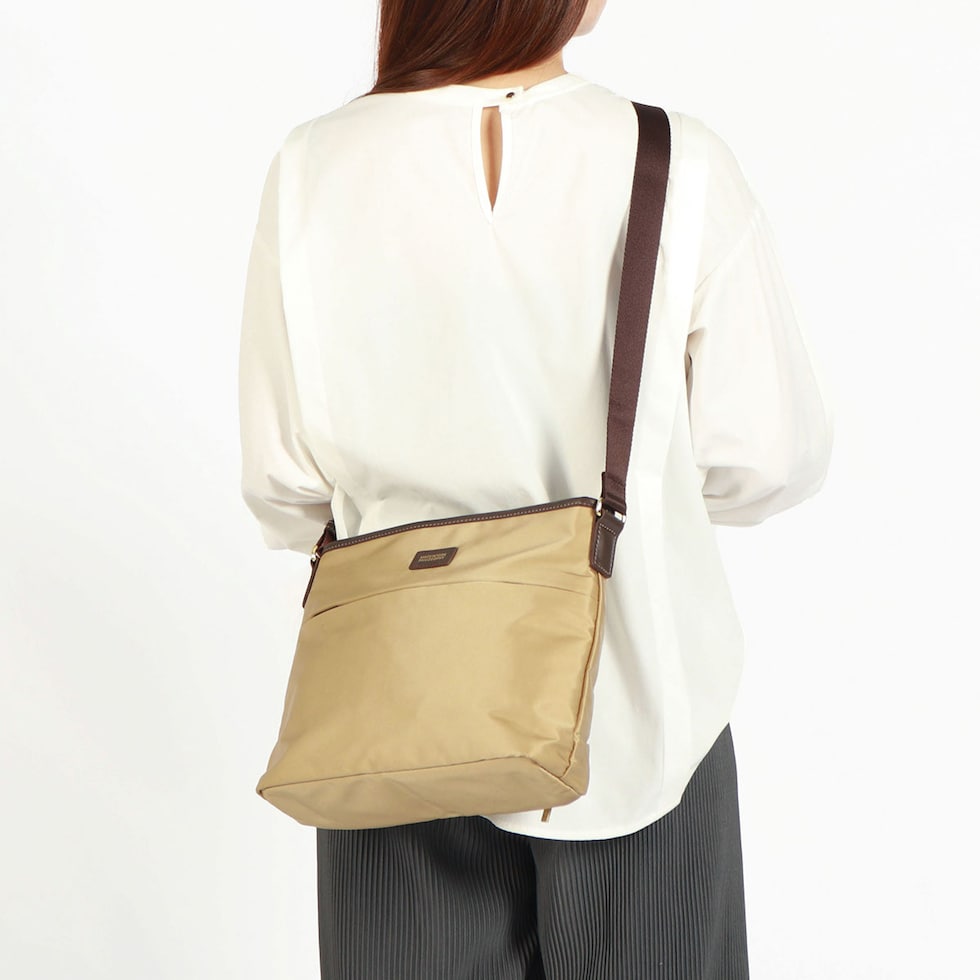 スタイルを選ばない、シンプルで上品なレディーストラベルシリーズ『アメリア2』のショルダーバッグです。薄マチながら収納力に優れ、日常から旅行まで幅広く活躍するアイテムです。B5サイズで、長財布も収納可能な使いやすい大きさが特徴。撥水・撥油機能を持つテフロン加工が施された生地で、急な雨にも安心です。光沢のある上品な素材を使用し、エレガントな印象を演出します。