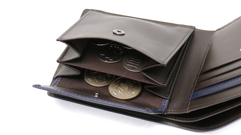 小銭入れはマチ付きのため内部が大きく開き、確認や取り出しを容易に行えます。また、内部には仕切りが備わっているため、お好みに合わせて硬貨の管理を行うことができるのも使いやすさのポイントになっています。