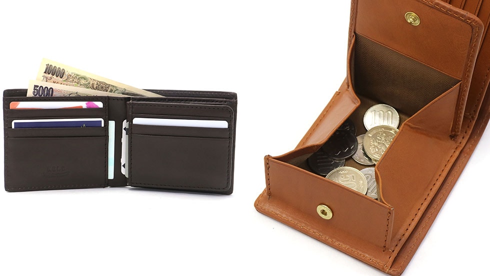 視認性の良い収納部は、カードポケットや領収書の整理に役立つフリーポケットを多数設け、機能面も充実。小銭入れはボックス型なので大きく開き、スムーズに小銭の出し入れができます。