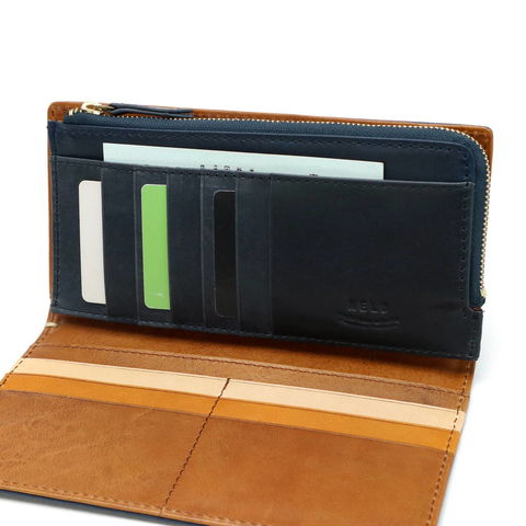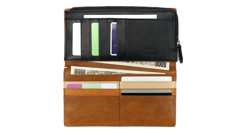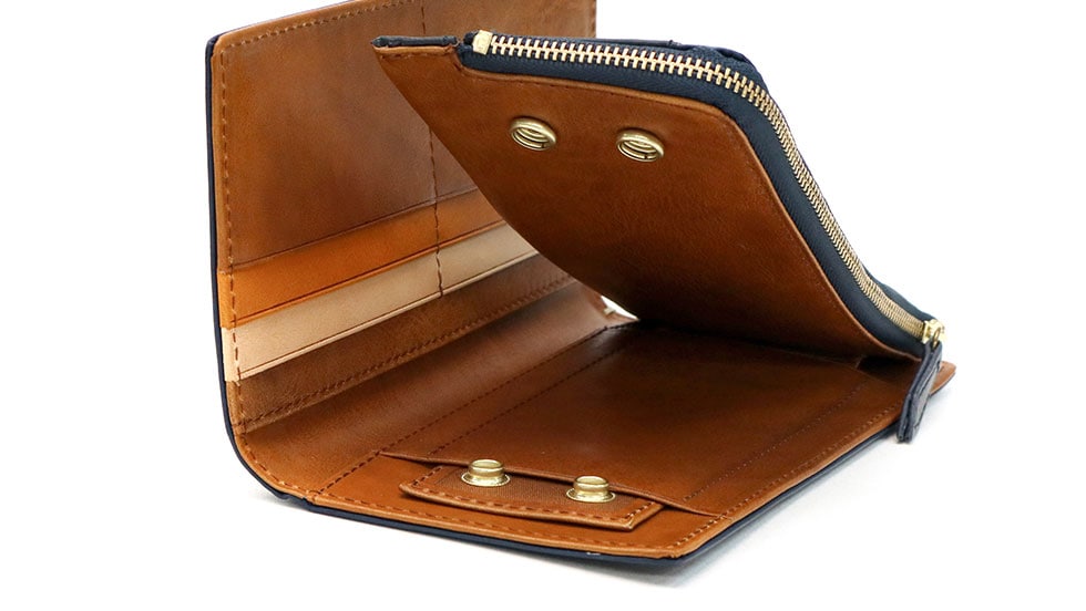 本体は留め具のない二つ折り仕様となっており、お札や小銭の収納はもちろん、カードポケットを豊富に備えたつくりとなっています。小銭入れ内にもポケットを備えているため、ポイントカードなどお会計時に使用するカード類をしまうのにも便利です。