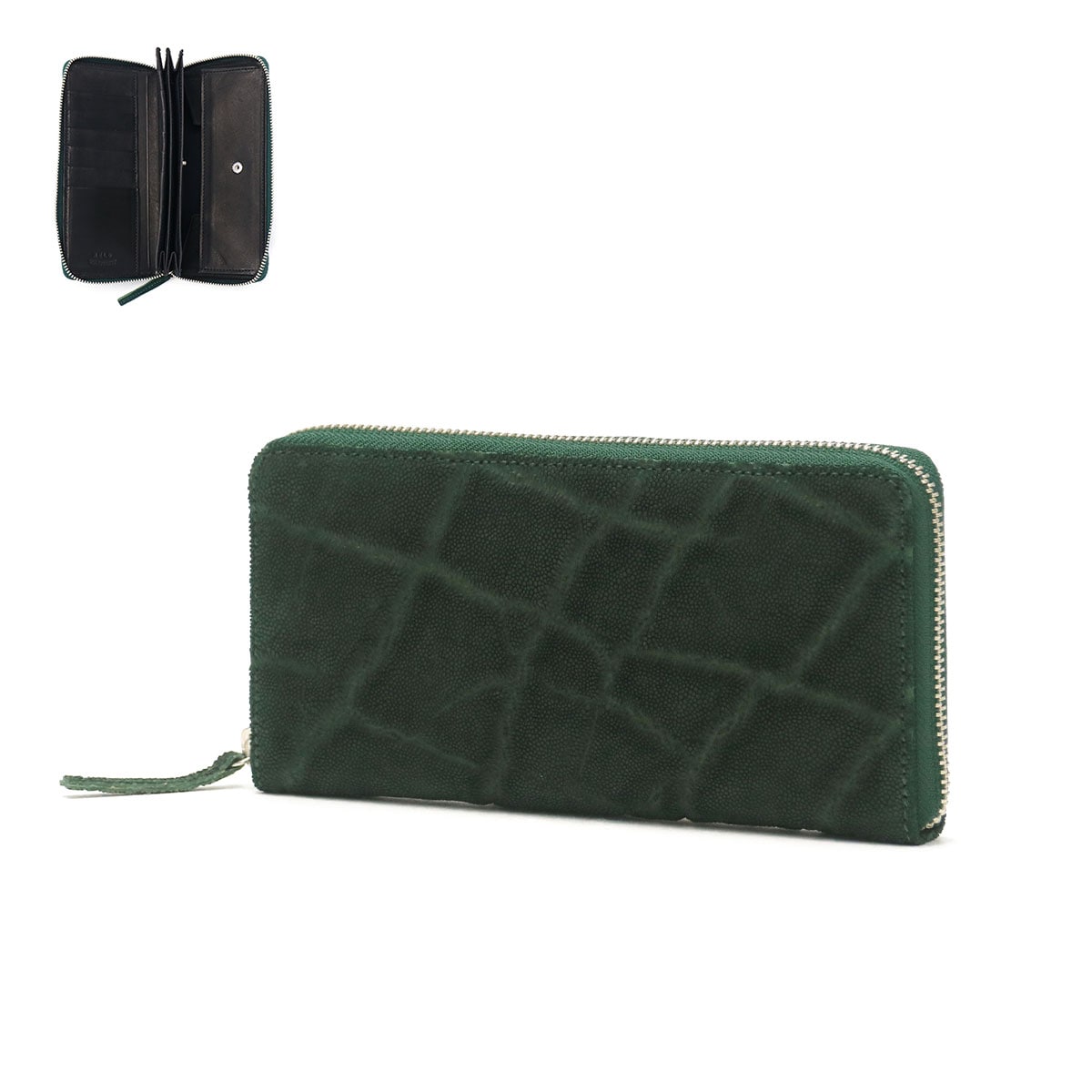 開運、幸運と言われる希少性の高いエレファントレザーを使用した長財布。古来から神と奉られたり、幸せの証といわれてきた象。その為象革も、持つ人に幸運を呼ぶと言われています。柔らかくしっとりとした手触りでありながら、摩擦に強く耐久性に優れているので、永く愛用いただけるアイテムです。