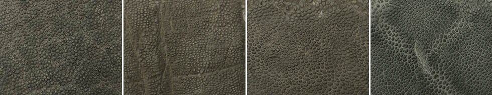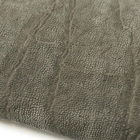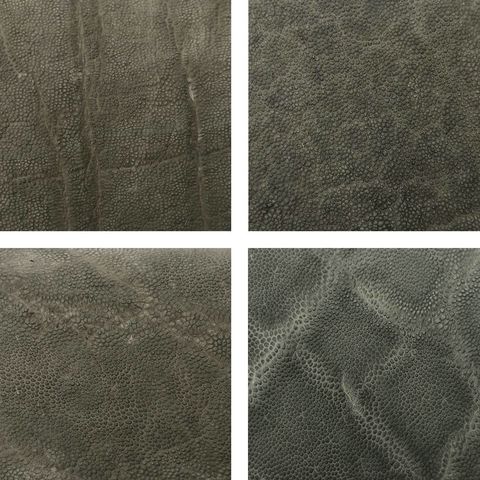 本体には、アフリカのジンバブエ産の象革を使用。コシのある質感と表情豊かなシボの風合いが特徴です。また、ワイルドなイメージと異なり、起毛感のある柔らかくしっとりとした手触りも魅力的。象革特有の擦れ感やシワ、毛穴など特徴的な表情には個体差があり、様々な雰囲気をお楽しみいただけます。
