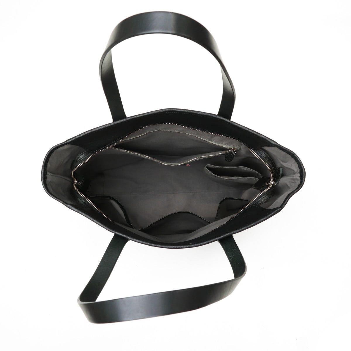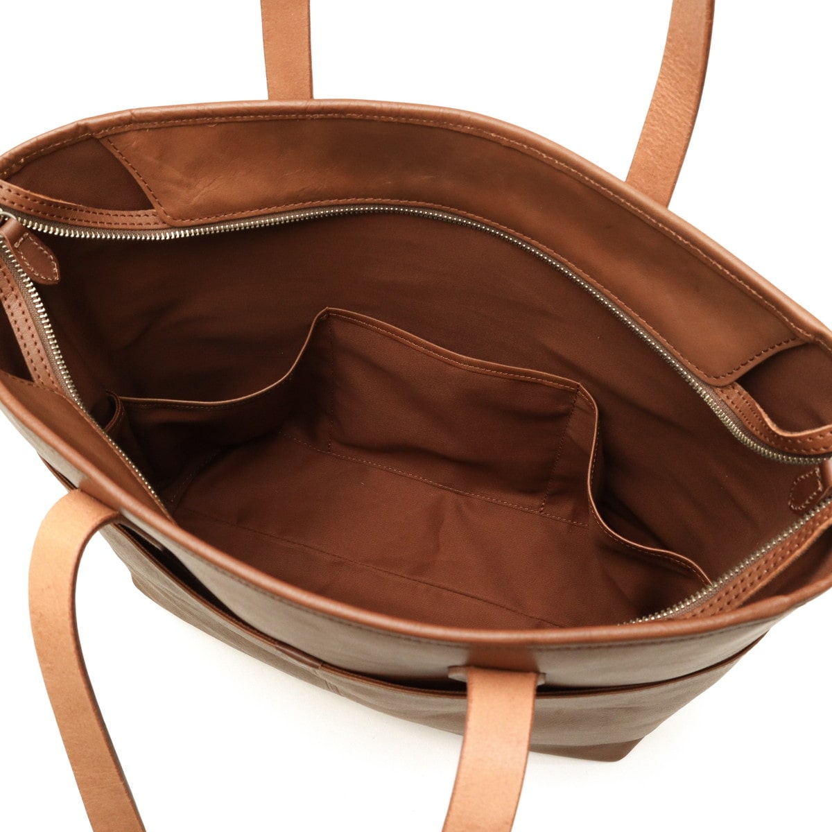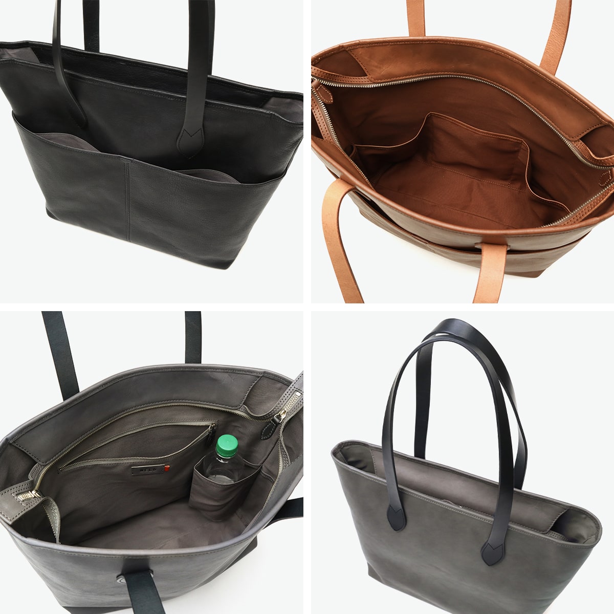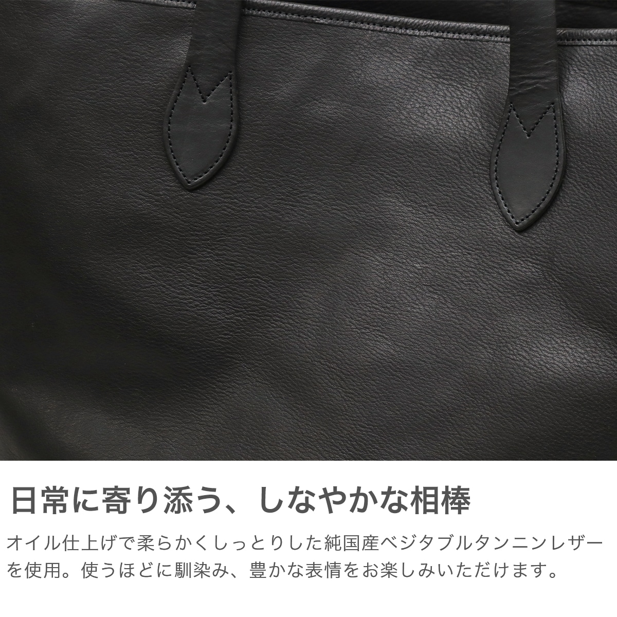 江戸時代から続く皮革の産地・兵庫県たつの市で、原皮から鞣しまで一貫して仕上げた純国産ベジタブルタンニンレザーを使用したトートバッグです。自然なシワと豊かな表情、オイルでしっとりと仕上げた柔らかな風合いが魅力です。A4サイズがしっかり収まり、自立するので通勤や旅行にも活躍。ファスナー付きで中身も安心。シンプルながらも品格漂う、大人のためのレザートートです。