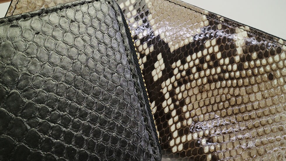 本体生地は、表から裏面にかけ継ぎ目のないダイヤモンドパイソンの一枚革を贅沢に使用しています。ブラックは蛇の腹側を使ったマットな光沢感、ベージュは蛇の背中側を使った艶感が特徴。カラーごとに異なる表情も魅力的です。