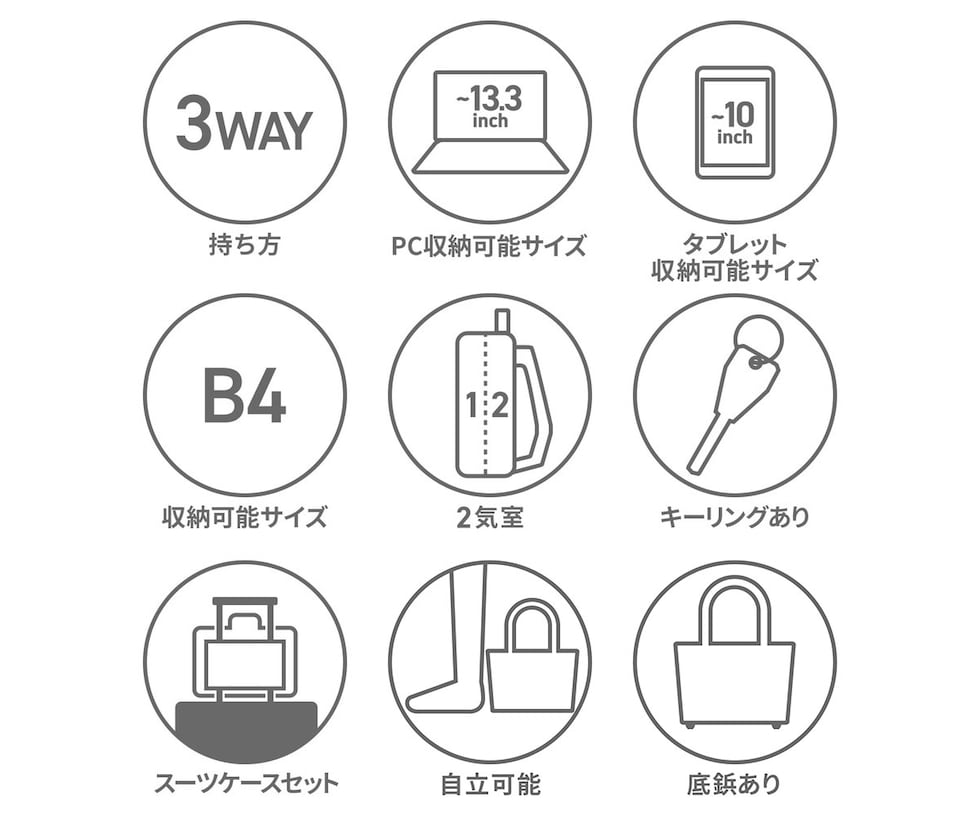 詳細説明 サイズの異なる2つのデバイス収納を設けたB4サイズ対応の大きめなつくりのメインルーム。その他にも、ポケットを多数配置することでビジネスアイテムの仕分けもスムーズに。付属のショルダーストラップや、格納式のリュックストラップを装着すれ3WAYで使用可能なので、シーンに合わせて使い分けることができます。また、底面には汚れが拭き取り易いコーティング素材を使用し、ファスナー付け根を隠したデザインが特徴的なスライダートンネルを採用した前面ポケットなど充実のディテール。ベーシックなデザインながら、ビジネスバッグの究極とも言える仕上がりを実現しました。