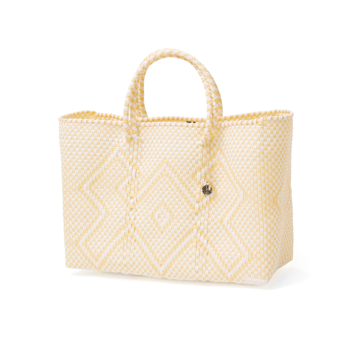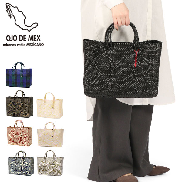 メキシコのエッセンスやカルチャーを盛り込んだ『OJO DE MEX/オホデメックス』のトートバッグ。ヒストリカルな紋様を丁寧に編みあげたハンドメイドのアイテムです。素材は再生のプラスチックで編まれていて、汚れにくく水にも強いためお手入れも簡単。手提げ用に短めに作られた2重のハンドルは、持ちやすいだけでなくルーズになりすぎないスタイルに仕上げてくれます。A4サイズがすっぽり収まる収納部は、マチも広めに確保されており、気軽な大きさと十分な収納力で、日常使いに最適です。
