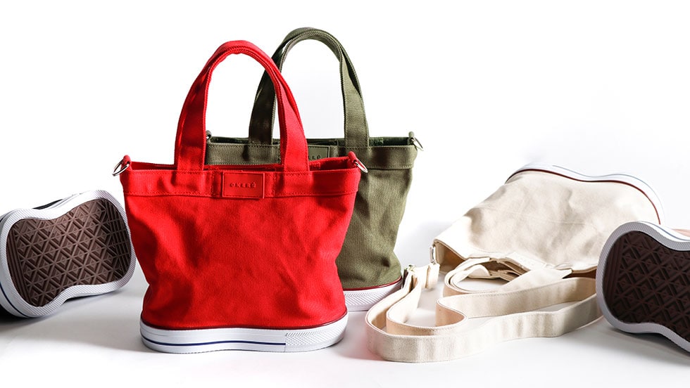 「バッグが靴を、履いたなら。」"置ける"をコンセプトに、バッグと靴のソールを合体させた「シューズバッグ」という新しいプロダクトをデザインする『OKERU』のトートバッグ。気兼ねなく床や地面に置ける使いやすさと、周囲を驚かせる遊び心の詰まったユニークなデザインが魅力です。