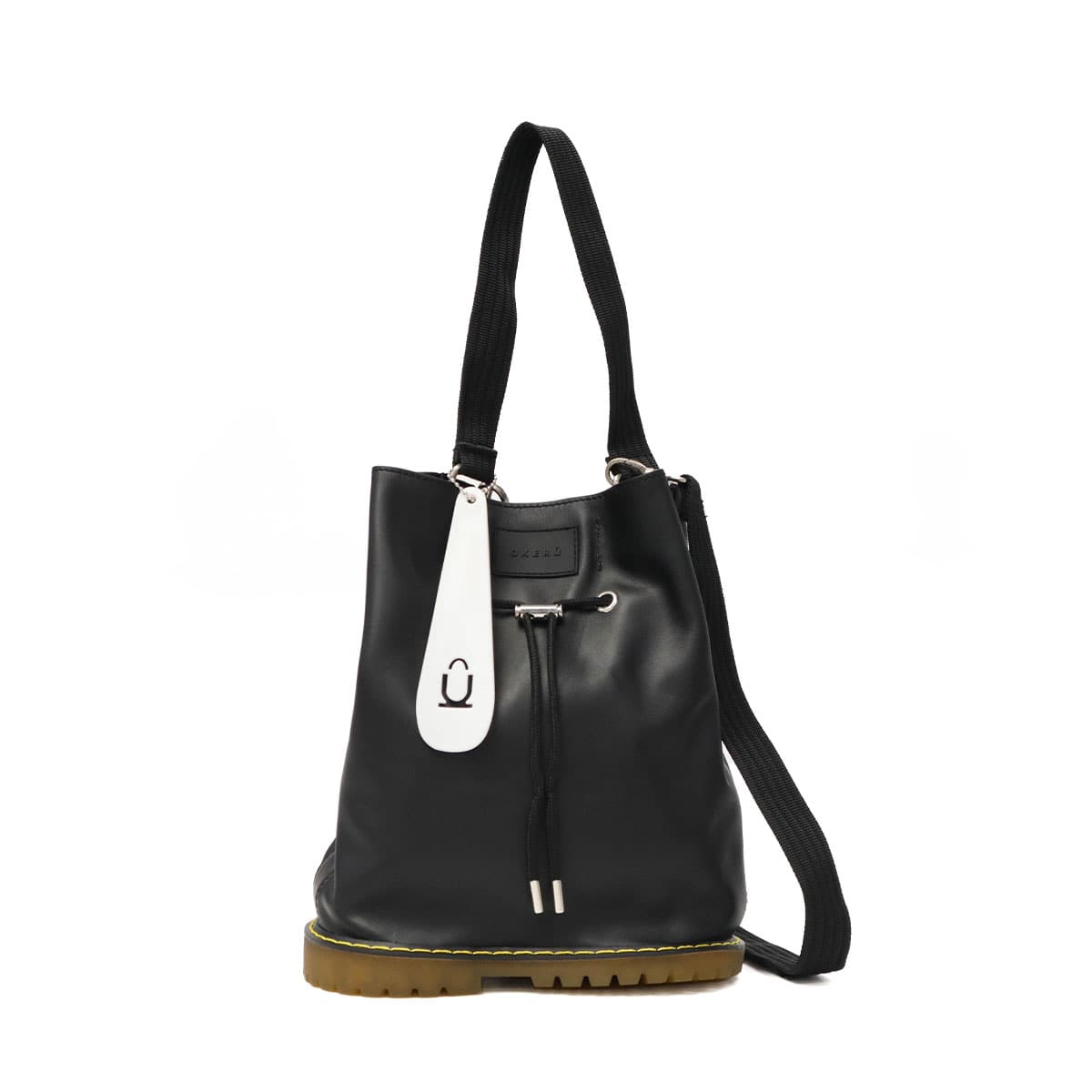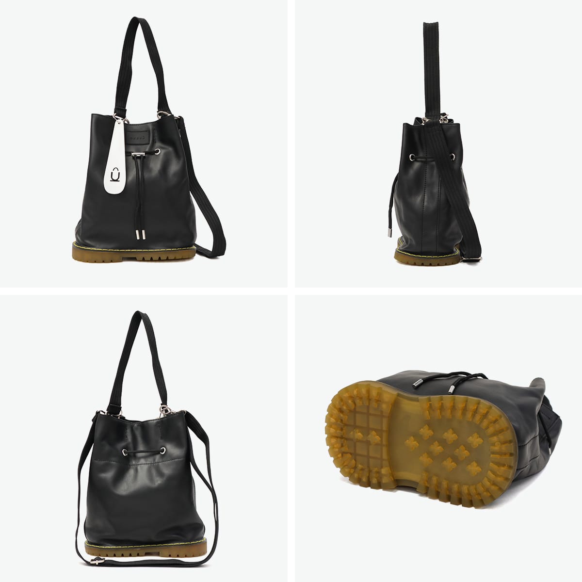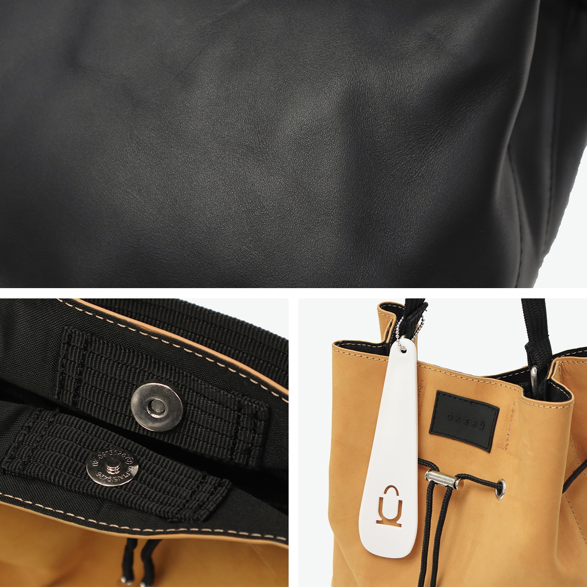 ワークブーツのソールデザインを取り入れた、OKERUの2WAYトートバッグ。上質な牛革を使用し、コンパクトながらB5サイズが収納可能。巾着仕様のデザインで程よい可愛らしさも。ショルダーにもなる便利なデザインと自立するフォルムでお出かけにも最適。カジュアルにも上品にも馴染み、どんなコーデにも合わせやすいのが魅力です。