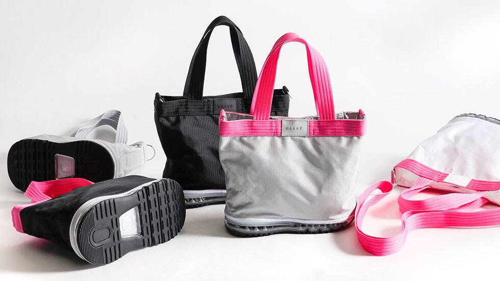 「バッグが靴を、履いたなら。」"置ける"をコンセプトに、バッグと靴のソールを合体させた「シューズバッグ」という新しいプロダクトをデザインする『OKERU』のトートバッグ。気兼ねなく床や地面に置ける使いやすさと、周囲を驚かせる遊び心の詰まったユニークなデザインが魅力です。