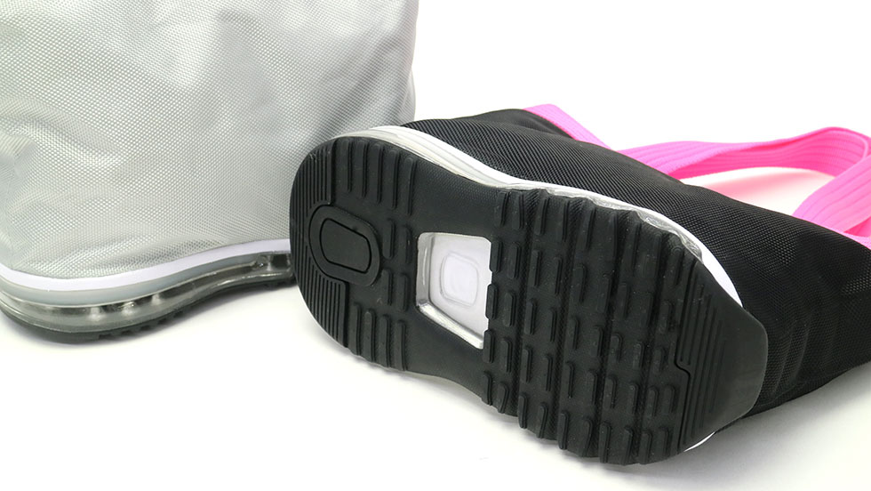 ハイテクスニーカーのデザインを落とし込んだソールがしっかりとバッグを自立させ、床に置いた姿も「絵になる」デザイン。また、本体には柔らかな光沢が持ち味の、耐久性に優れた1680デニールの「ポリエステルオックス」を使用しています。