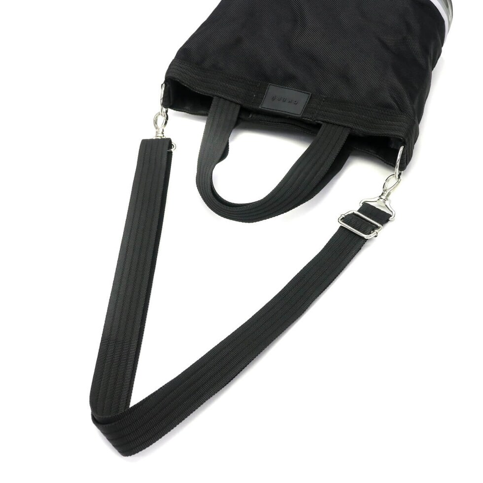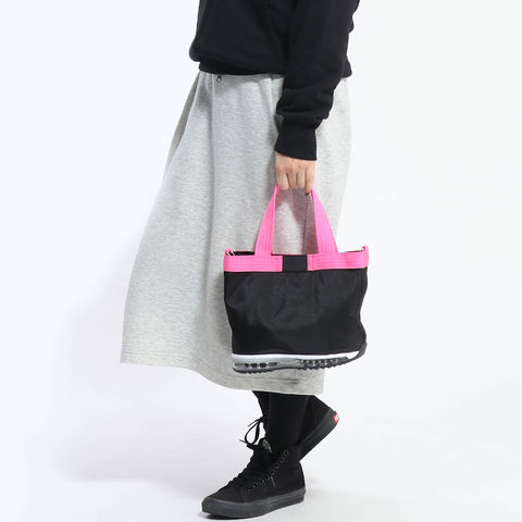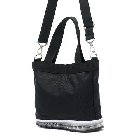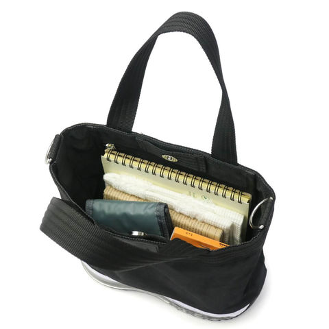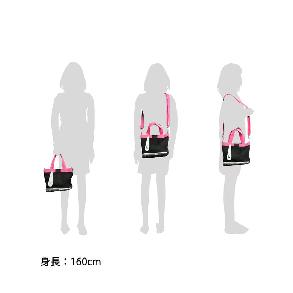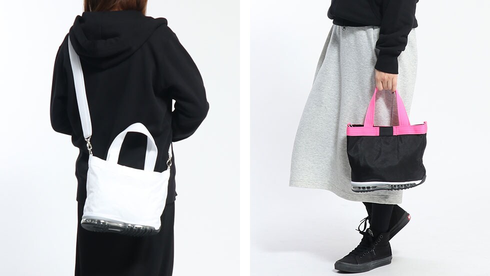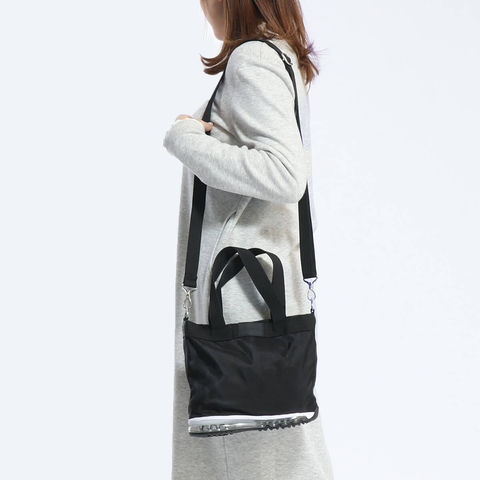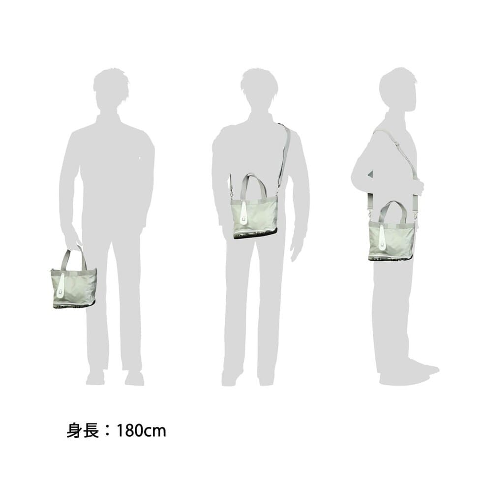 取り外し可能なショルダーベルトが付属しているので、シーンに応じて手持ち、肩掛け、斜め掛けと持ち方が選べるのもうれしいポイント。光沢のある素材感がシャープな印象で、スポーツミックススタイルと相性も抜群です。