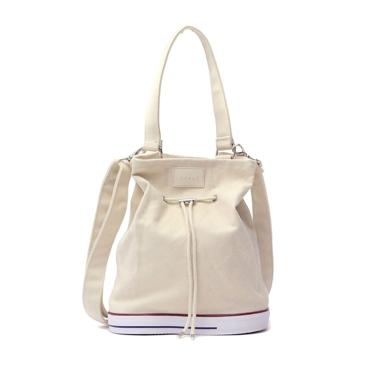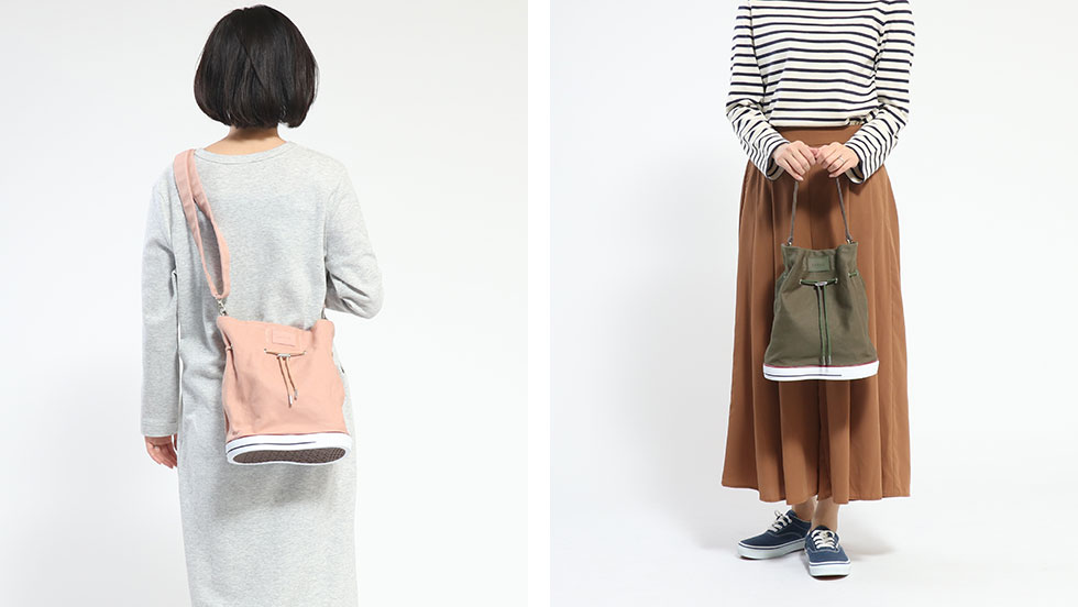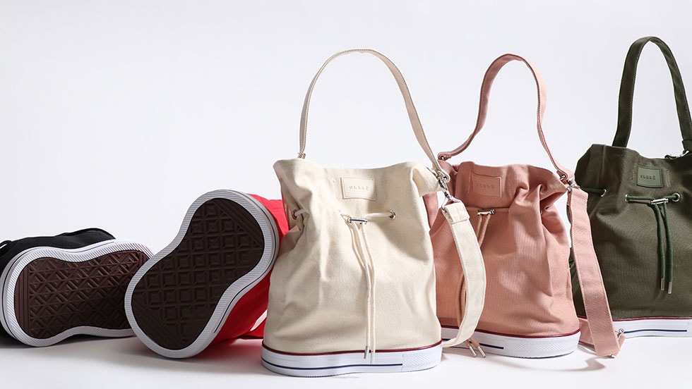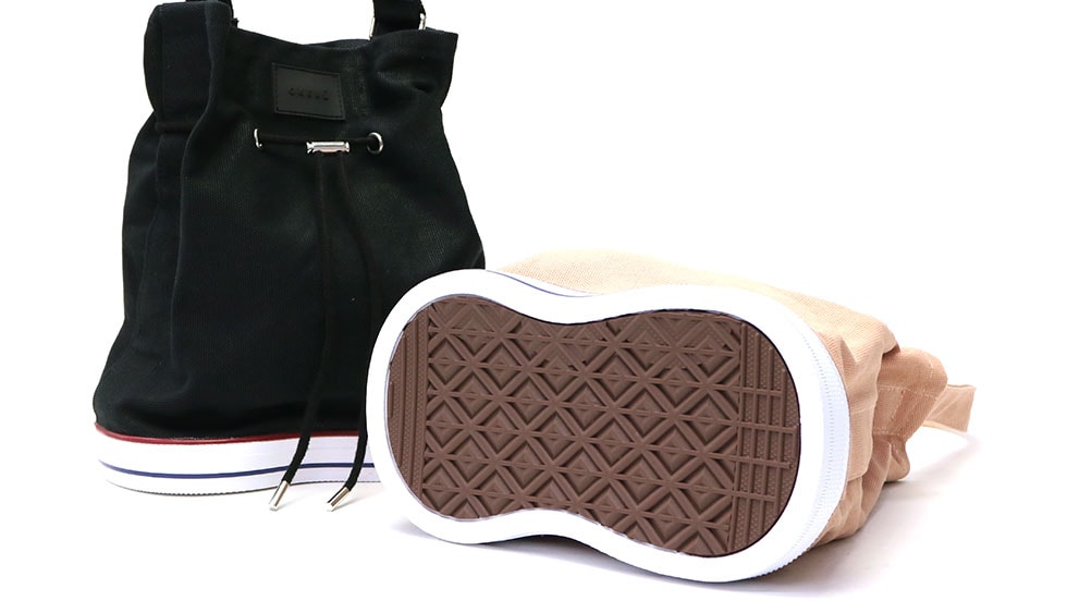 「バッグが靴を、履いたなら。」"置ける"をコンセプトに、バッグと靴のソールを合体させた「シューズバッグ」という新しいプロダクトをデザインする『OKERU』の2WAY巾着バッグ。気兼ねなく床や地面に置ける使いやすさと、周囲を驚かせるユニークなデザインが魅力です。