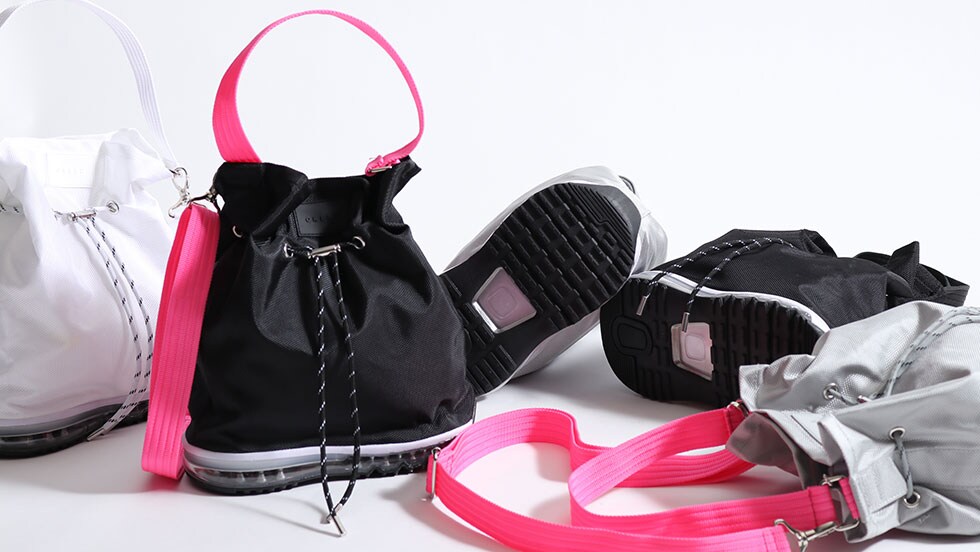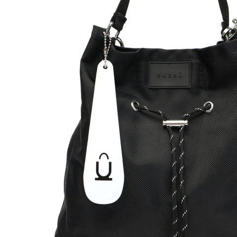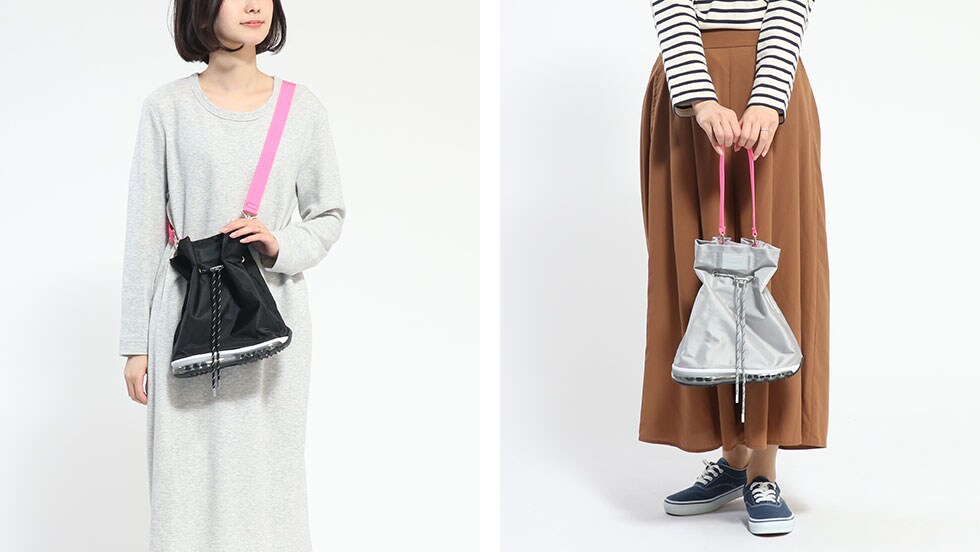 「バッグが靴を、履いたなら。」"置ける"をコンセプトに、バッグと靴のソールを合体させた「シューズバッグ」という新しいプロダクトをデザインする『OKERU』の2WAY巾着バッグ。気兼ねなく床や地面に置ける使いやすさと、周囲を驚かせるユニークなデザインが魅力です。