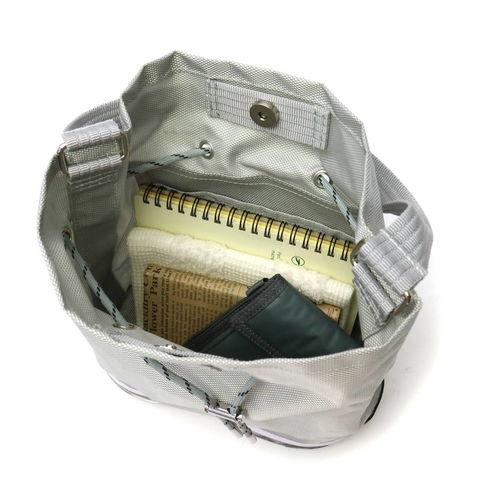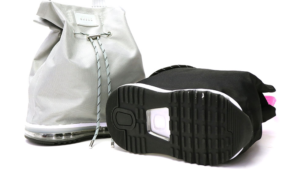 ハイテクスニーカーのデザインを落とし込んだソールがしっかりとバッグを自立させ、床に置いた姿も「絵になる」デザイン。また、本体には柔らかな光沢が持ち味の、耐久性に優れた1680デニールの「ポリエステルオックス」を使用しています。