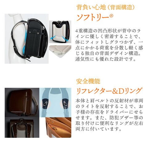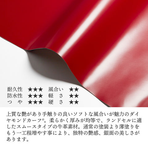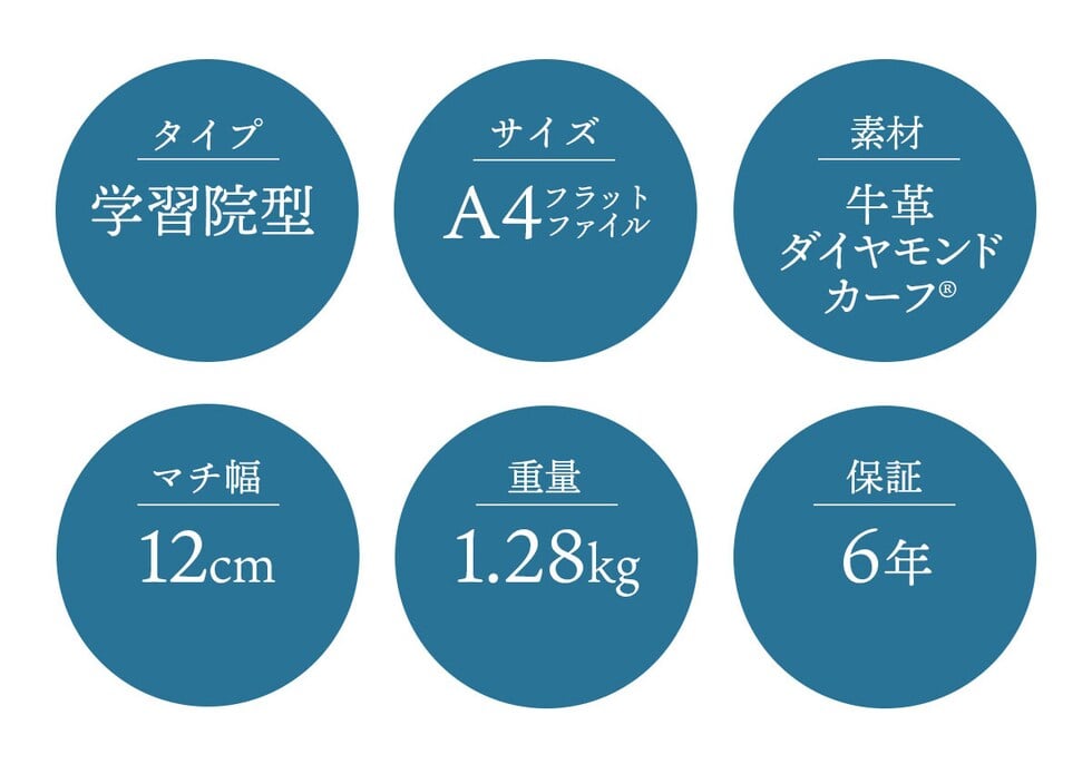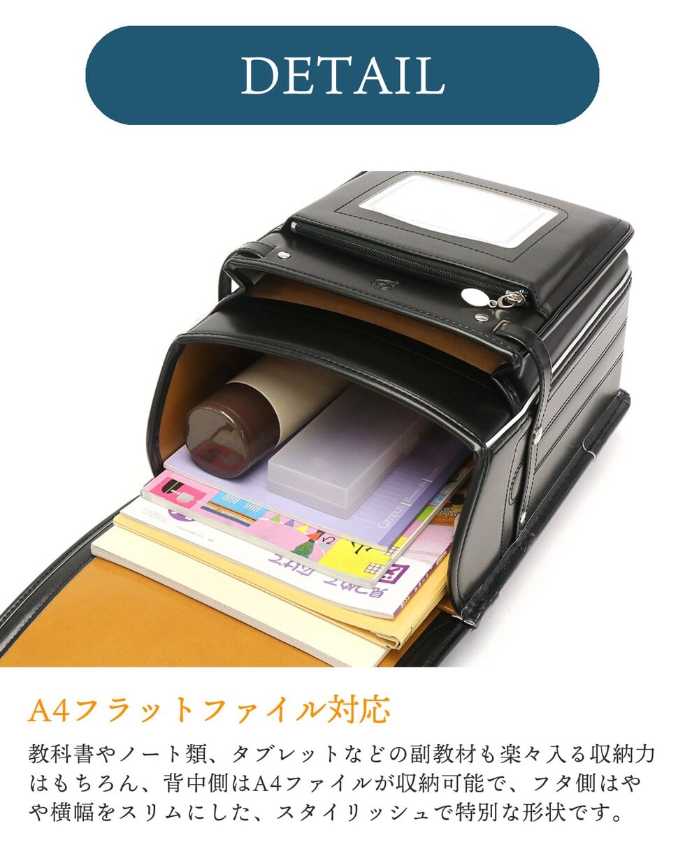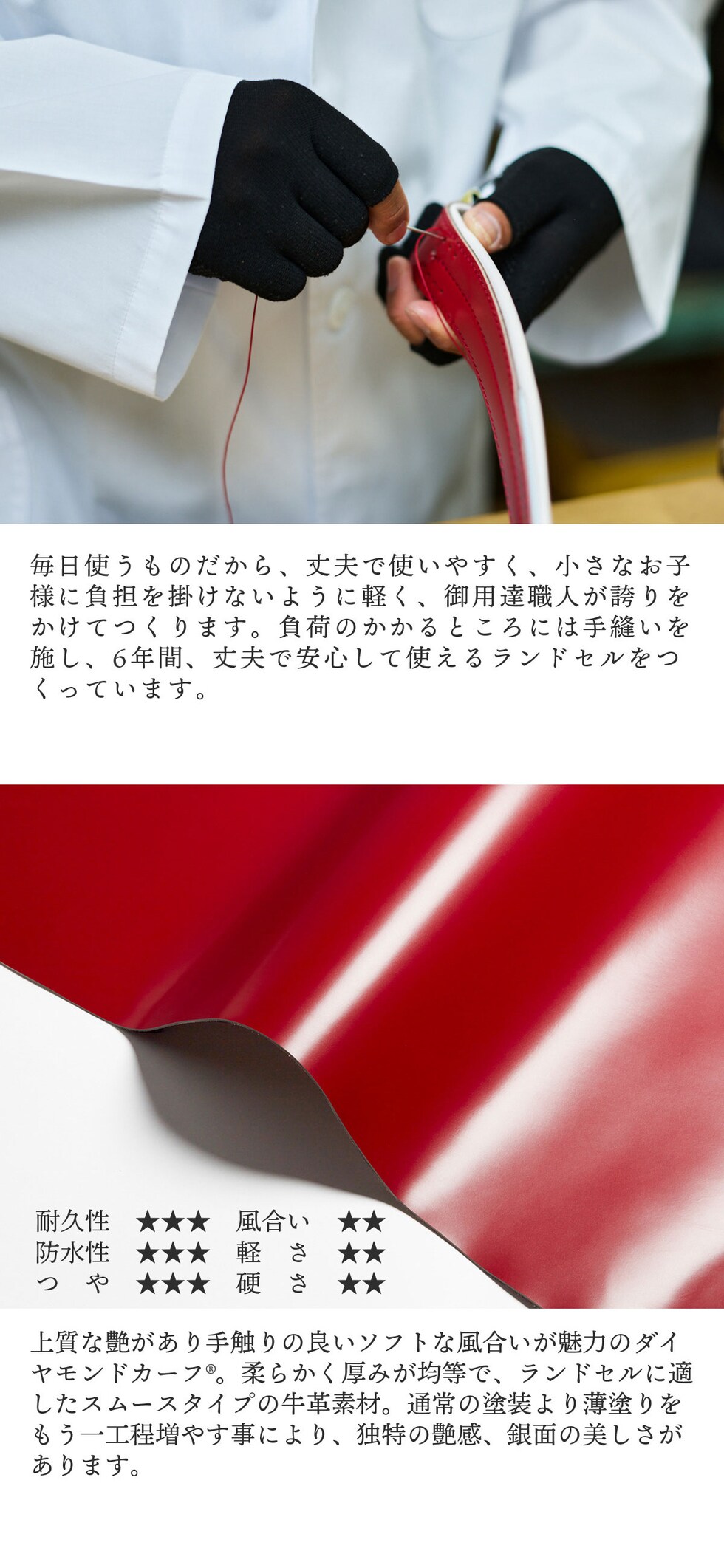 厳選された最高級の牛革に独自の加工を施し、ダイヤモンドのように煌びやかな艶と優しくソフトな手触りが特徴の「ダイヤモンドカーフ」を使用したランドセルです。クラシックなデザインが魅力で、伝統的なスタイルは文部大臣賞をはじめ、数々の賞を受賞してきた名品です。