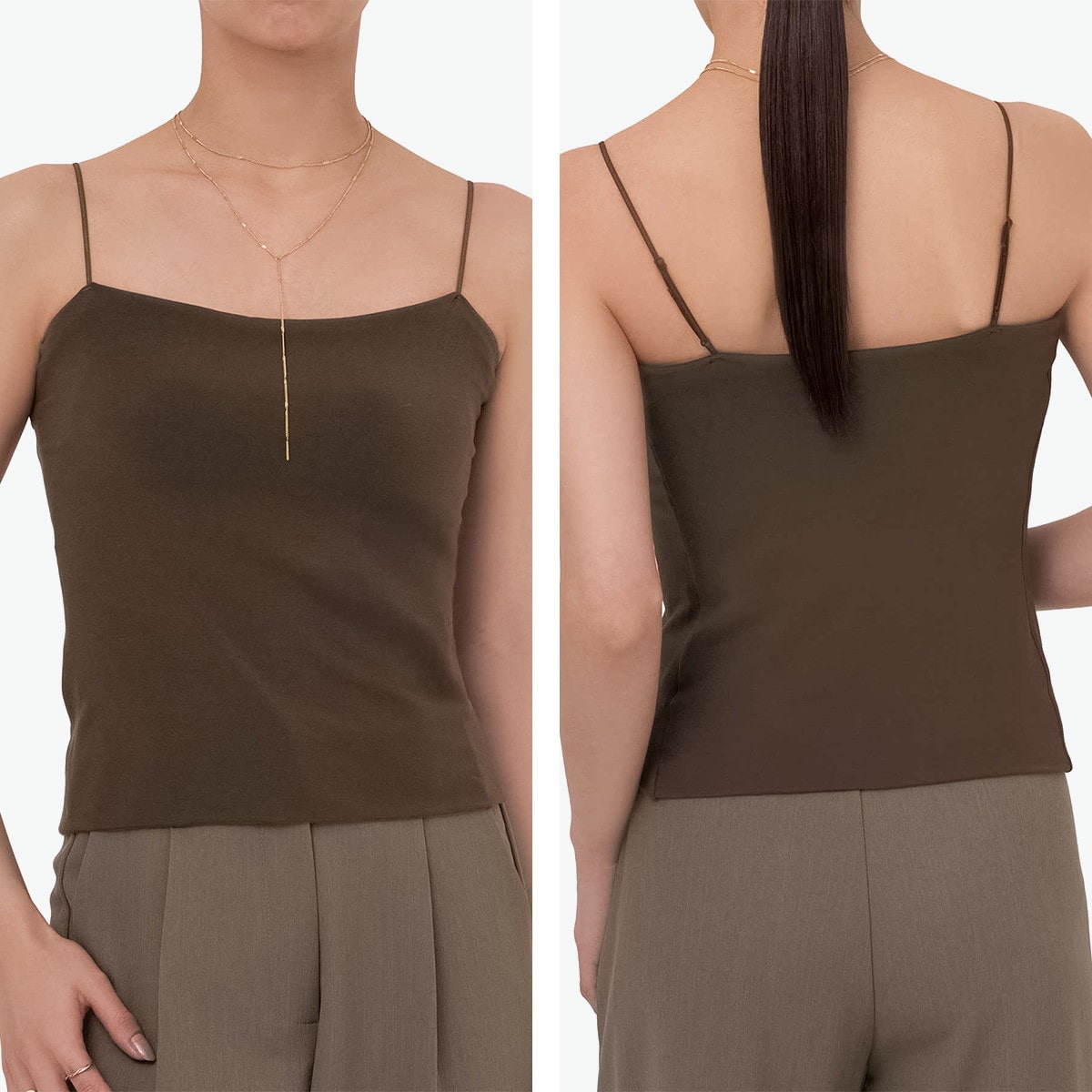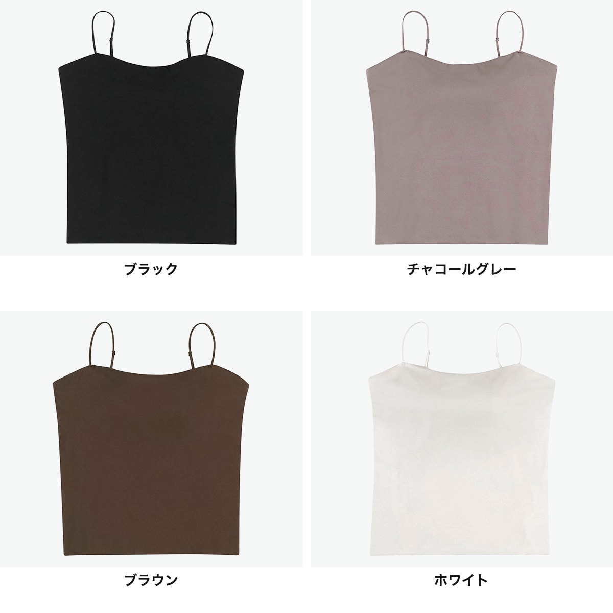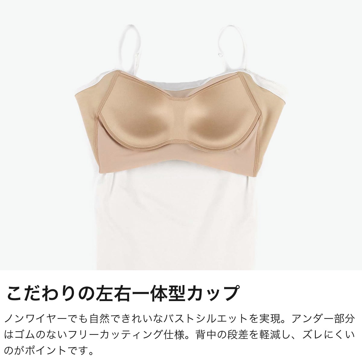 見せても重ねても使いやすい、シンプルを極めたカップ付きベアキャミソール。シーズンを問わず幅広いスタイリングで活躍するアイテムです。シアートップスやシャツのインナーとしてはもちろん、上に重ねる洋服を選ばず、洗練されたスタイリングを支えてくれる、ワードローブに1枚ほしい定番アイテム。華奢なストラップを使用し、表に見えるステッチを極力省いたミニマルなデザインで、胸元や肩まわりを見せても上品な印象に仕上がります。