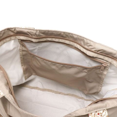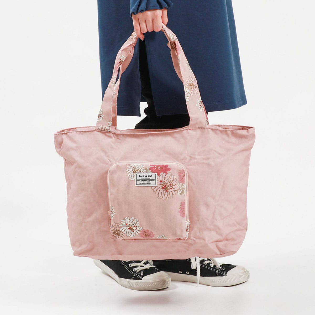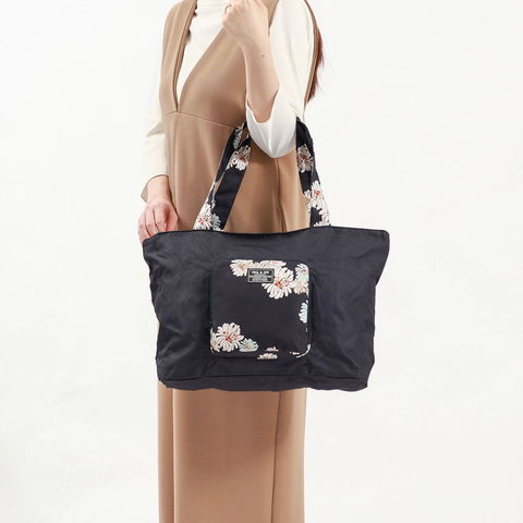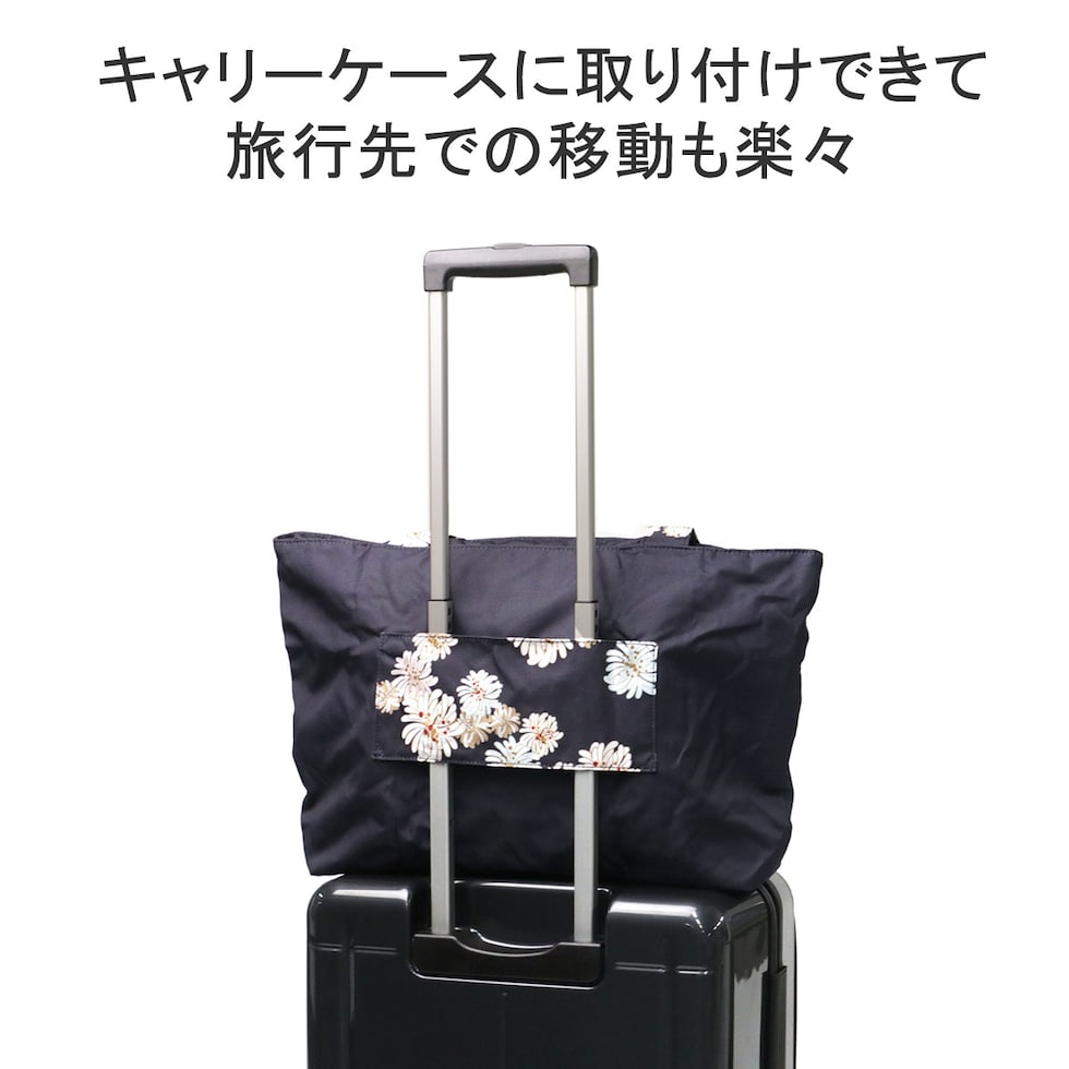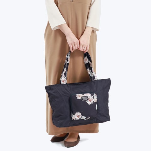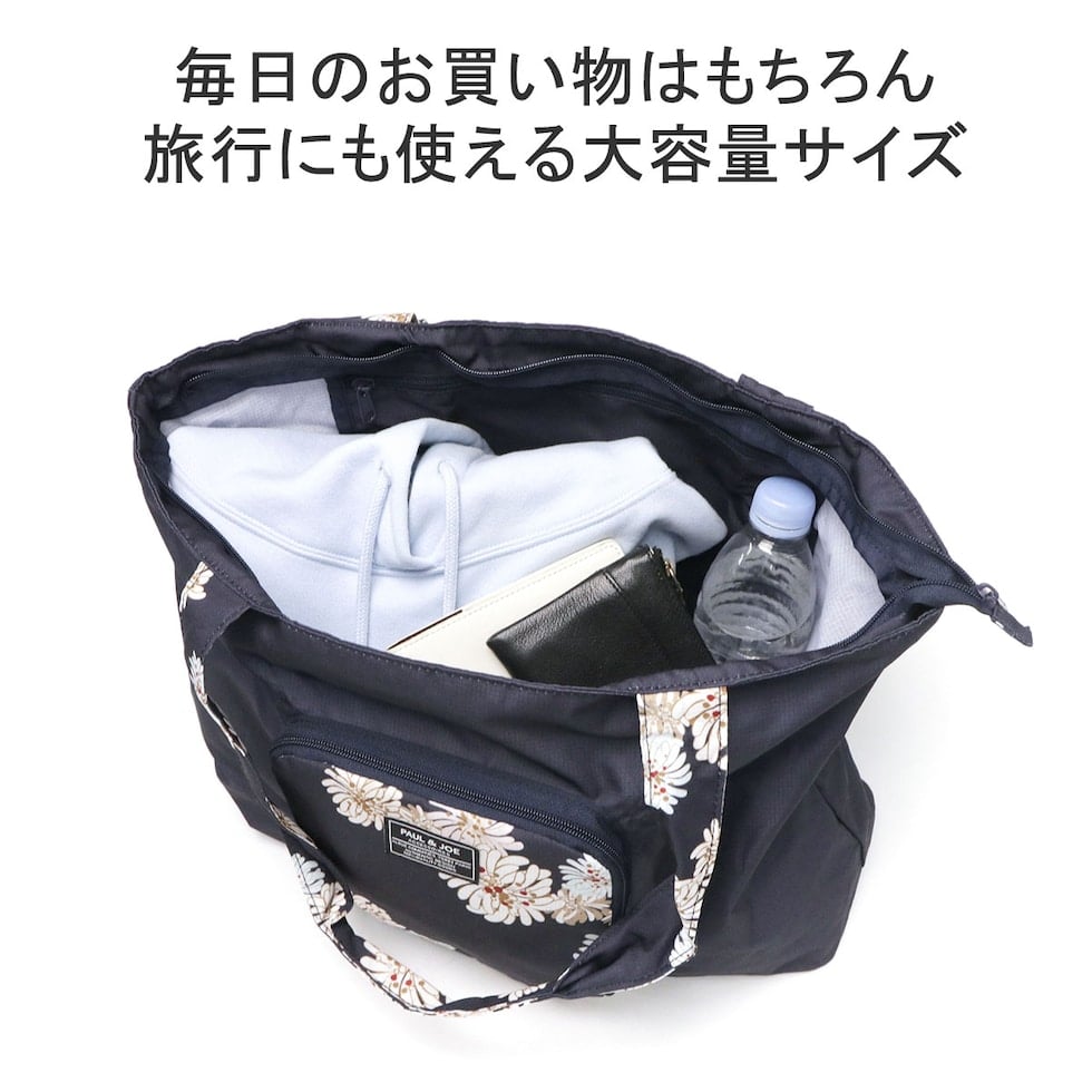 PAUL&JOEらしい華やかな「クリザンテーム」柄の上品さ溢れる折り畳みトートバッグです。軽量なポリエステルを使用しており、買い物やジムなどのお出かけにピッタリ。また、背面の通し穴にキャリーバッグのハンドルを通せばキャリーオンバッグにもなり、旅行にも便利なアイテムとなっています。