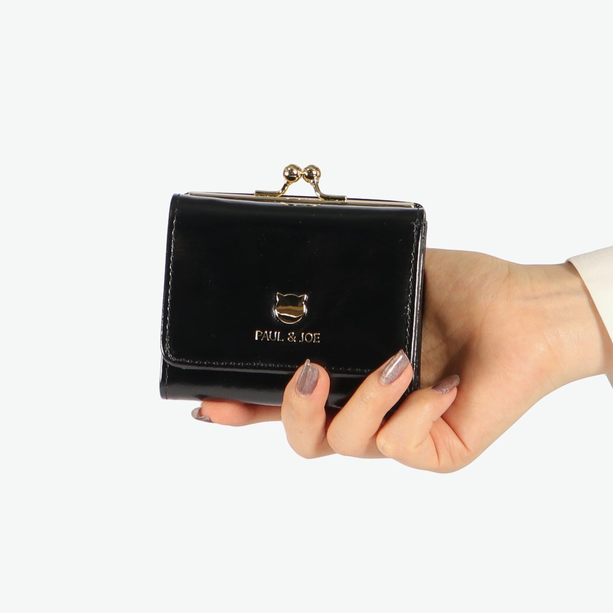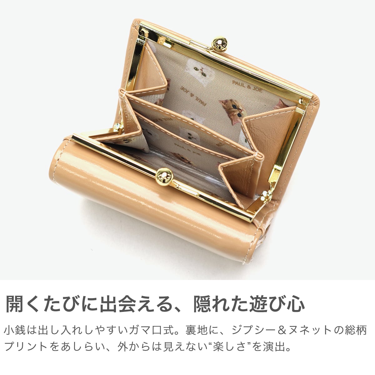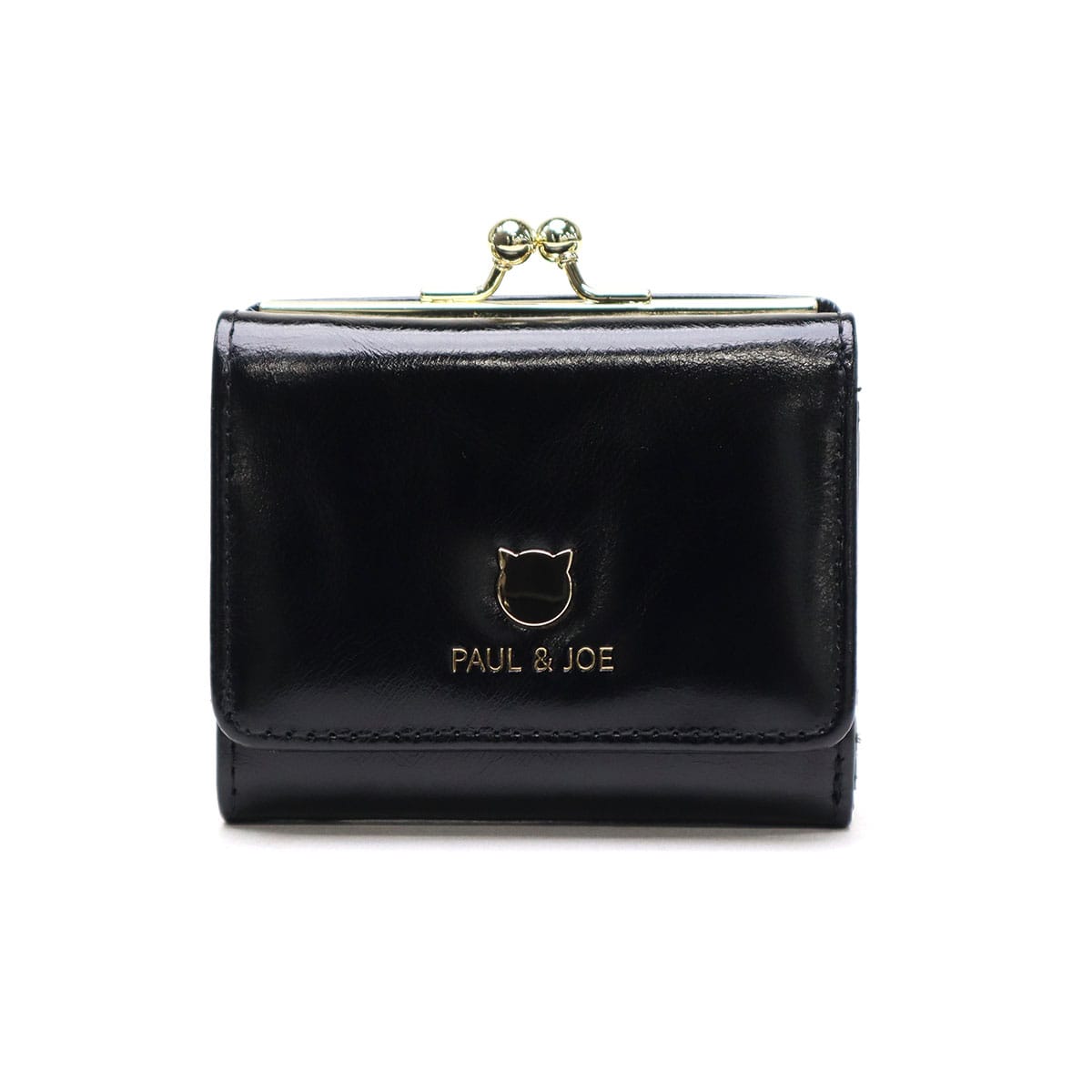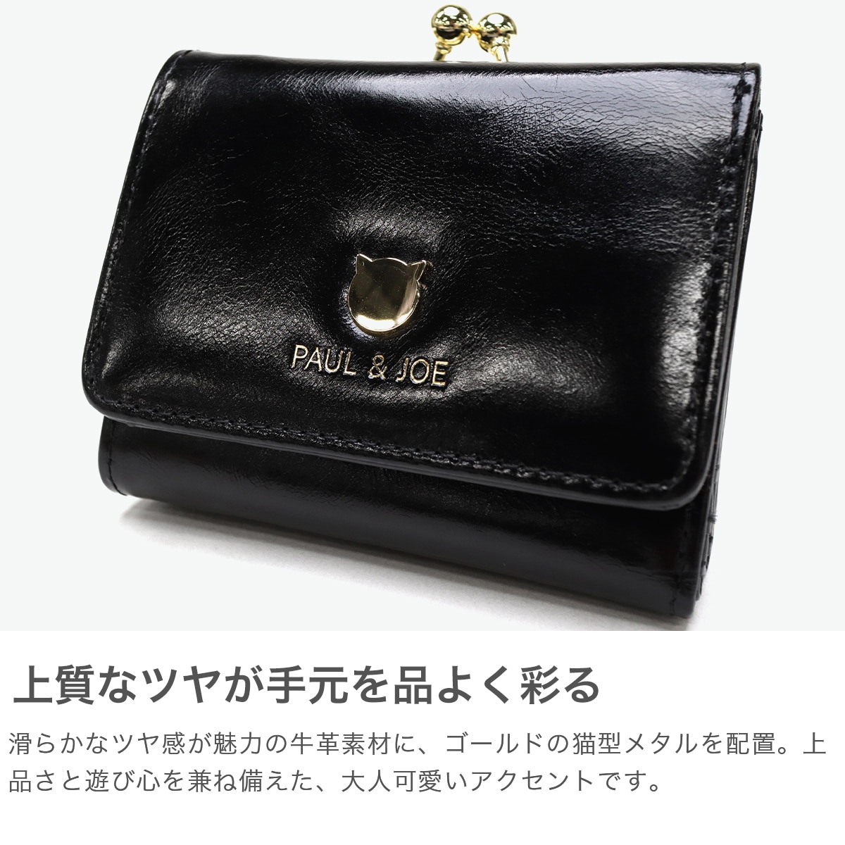 ゴールドの猫型メタルがシンプルでおしゃれなミニ財布。本体はツヤ感のある牛革を使用し、大人可愛い印象。ジプシー&ヌネットの総柄を裏地に採用した「PAUL&JOE ACCESSOIRES」らしい仕上がりです。コンパクトなサイズ感とがま口タイプの小銭入れで人気のデザインとなっています。