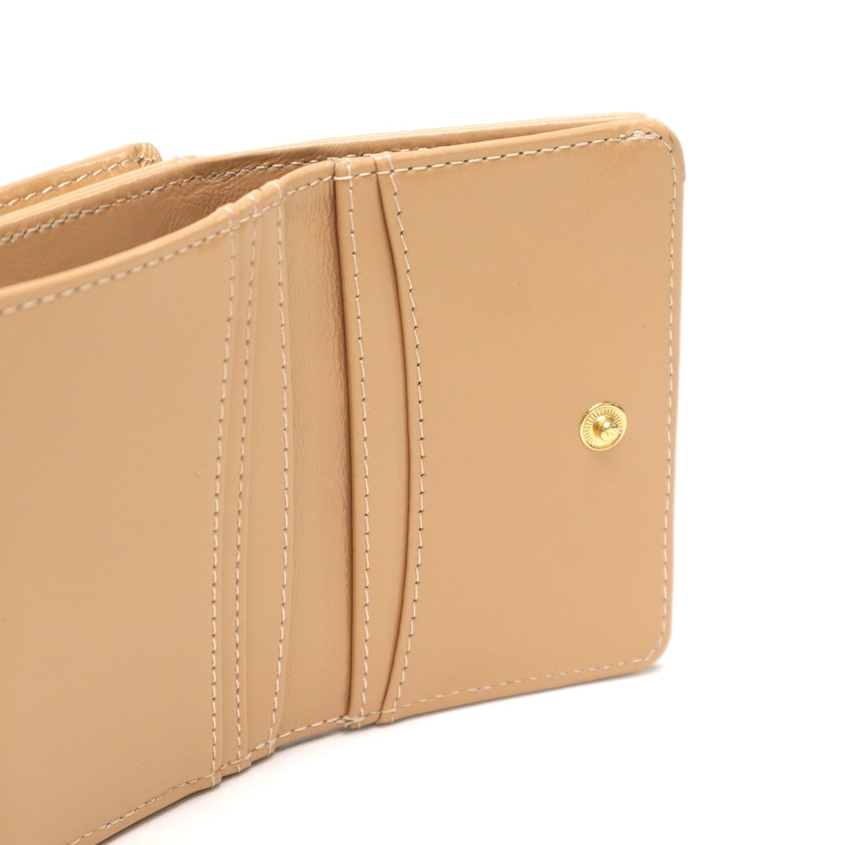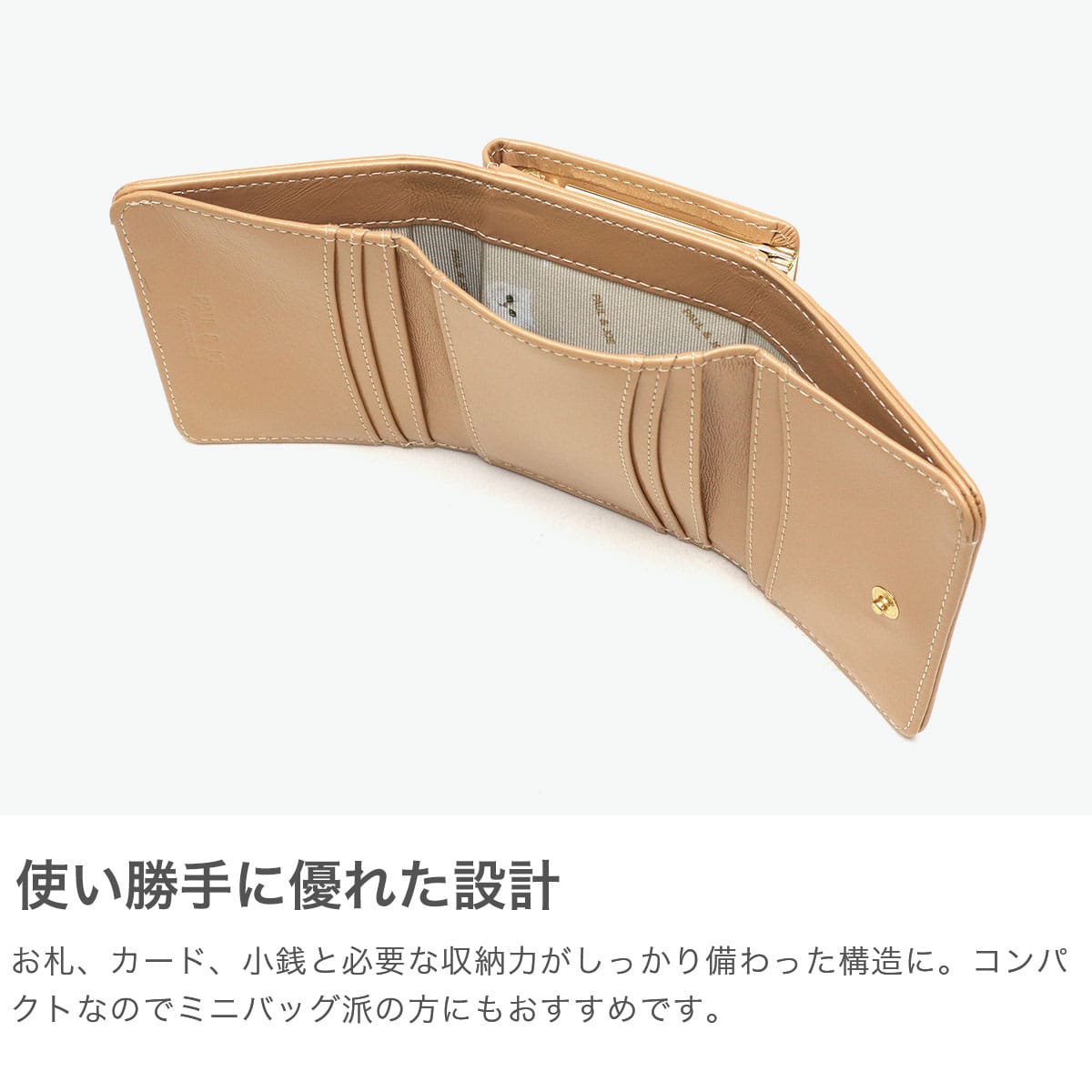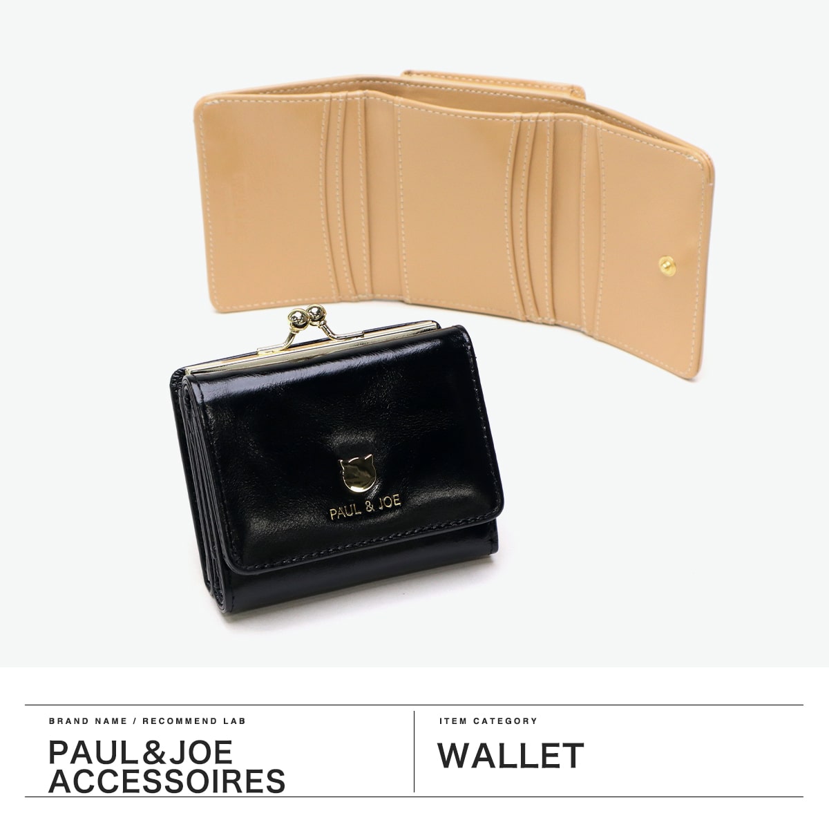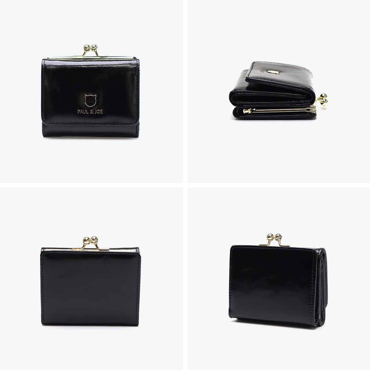 ゴールドの猫型メタルがシンプルでおしゃれなミニ財布。本体はツヤ感のある牛革を使用し、大人可愛い印象。ジプシー&ヌネットの総柄を裏地に採用した「PAUL&JOE ACCESSOIRES」らしい仕上がりです。コンパクトなサイズ感とがま口タイプの小銭入れで人気のデザインとなっています。